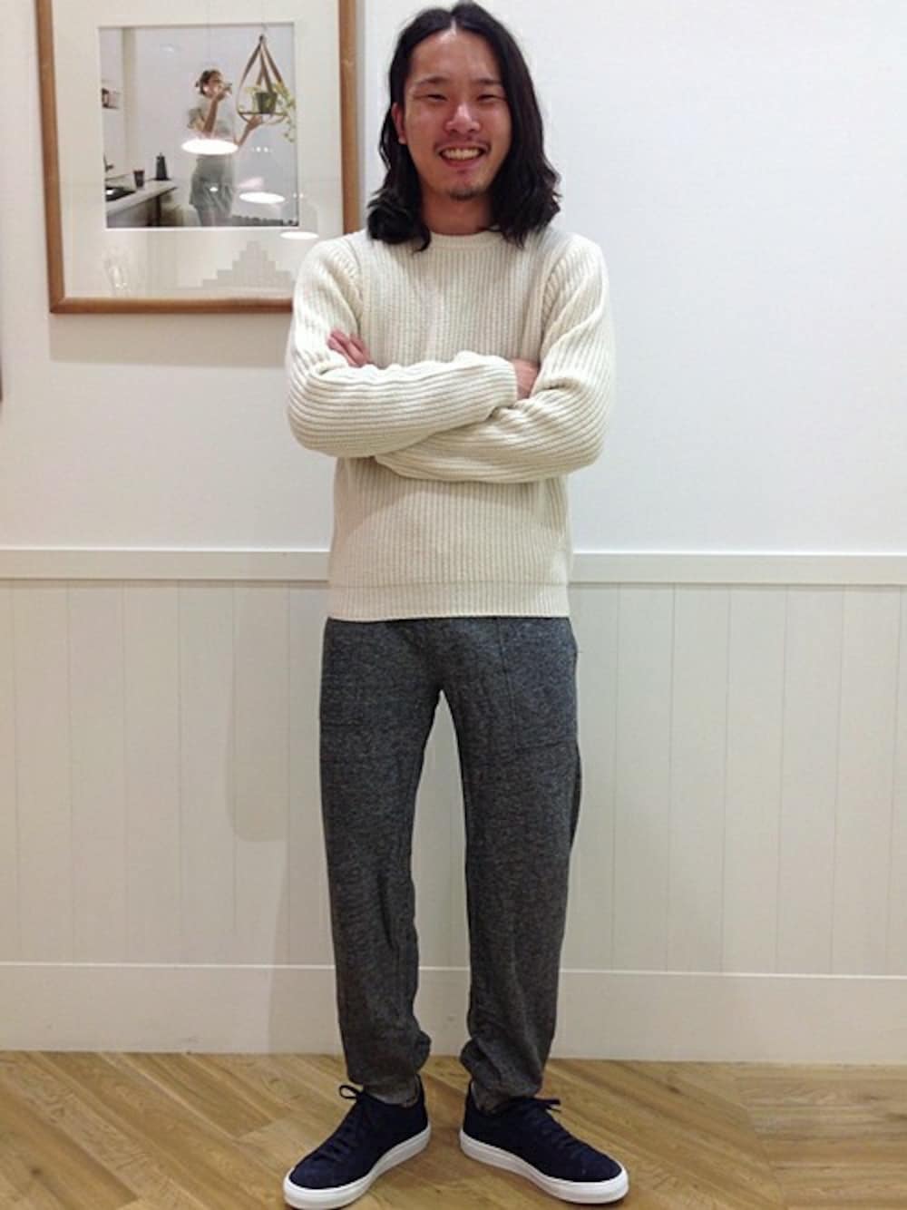 伸縮性の良いアゼのニットに柔らかく厚すぎないスウェットパンツ、スウェードのローカットスニーカーとどれも着心地抜群!デイズらしくシンプルにまとめたオススメコーディネイトです。