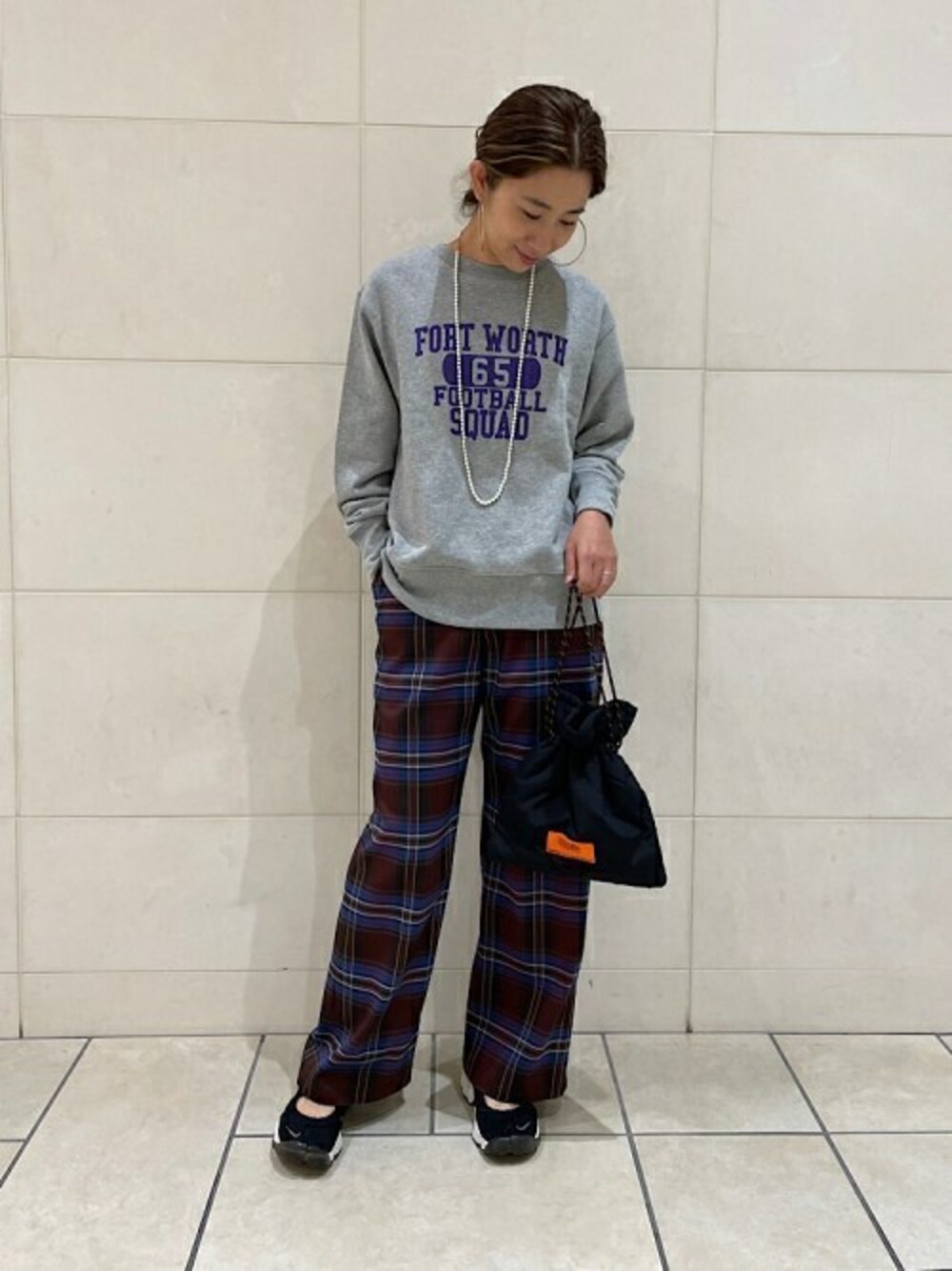 着用アイテム:722-00-0022 【SHIPS any別注】THE KNiTS: カレッジ スウェット 身長:162cm /普段サイズS orM /着用サイズ:フリー 着用アイテム:72723-14-0018 チェック バギー セミワイド パンツ 身長:162cm /普段サイズS orM /着用サイズ:38 今年のマストアイテム「LOGO Tシャツ」を柄の代表格チェックと合わせてみました。 そのままだとカジュアル過ぎるアイテムの合わせですが長めのパールと合わせることでグッと大人の印象に。 今回着用のチェックパンツは色と広がり過ぎないシルエットが◎ 晩夏はシンプルな半袖Tシャツでもオシャレにまとまりそうです。
