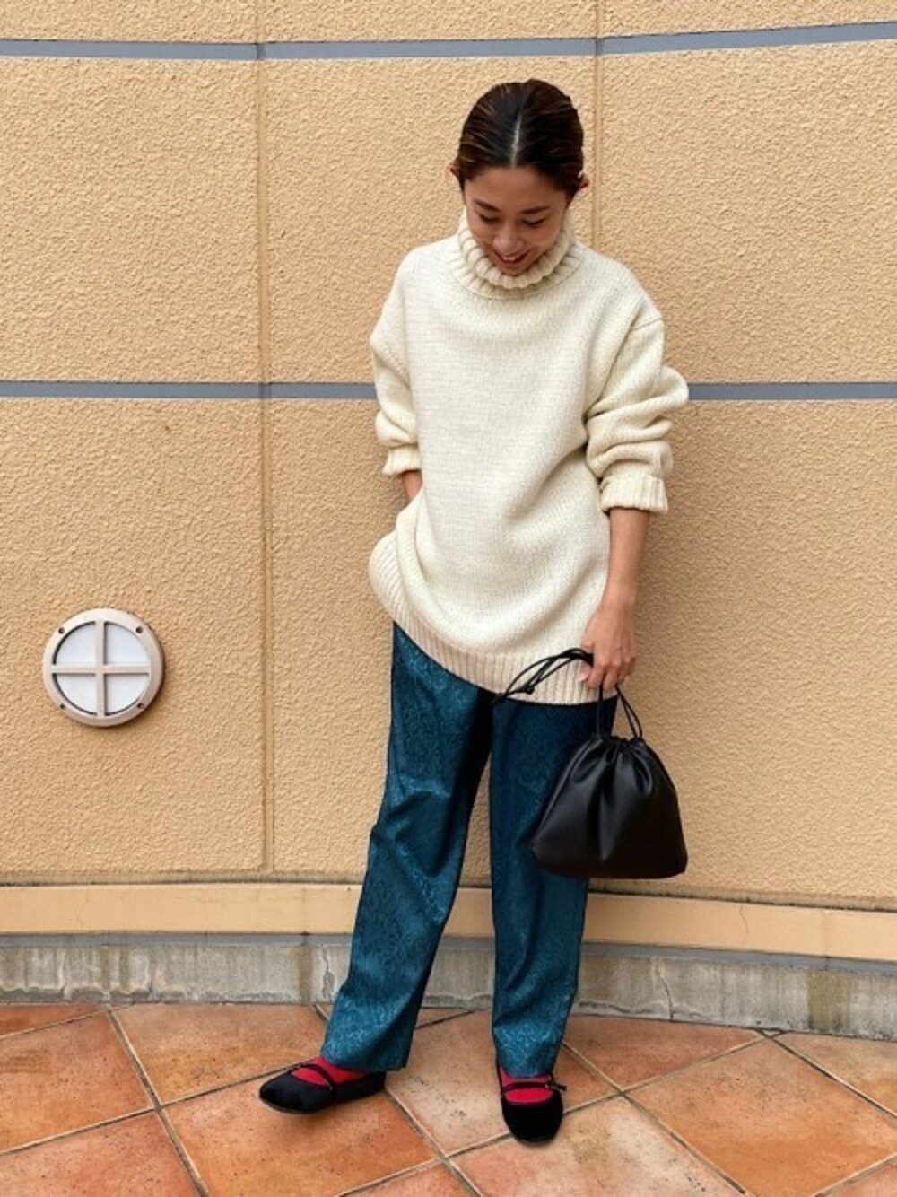 着用アイテム:723-15-0018 JQ EASY PT 身長:162cm /普段サイズS orM /着用サイズ:フリー 光沢感のあるジャガードのパンツは冬のシンプルコーディネイトのサシに◎ 単にニットと合わせるだけでもおしゃれな雰囲気を作り出してくれます。