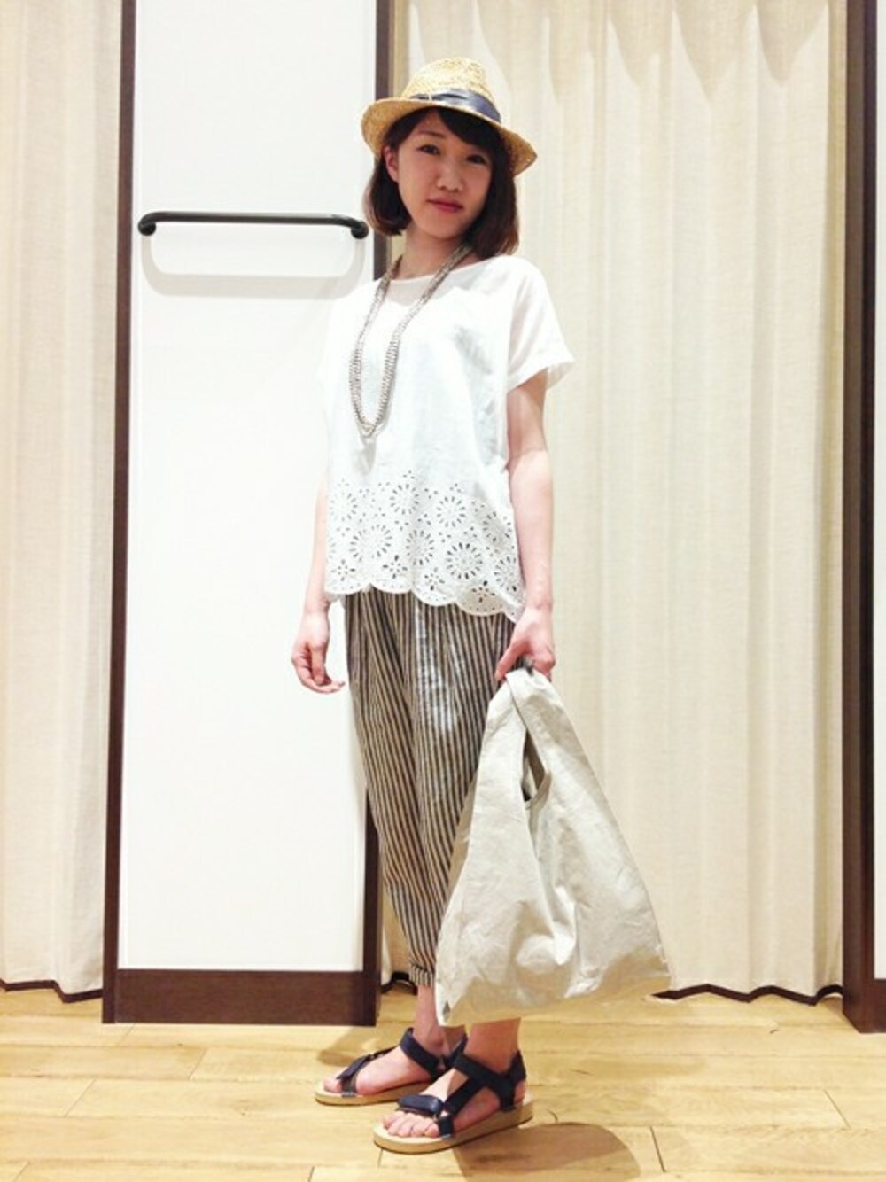 今回はサルエルパンツを中心にコーディネイトしてみました。 このパンツは麻の素材感が心地よく、湿度の高くなってくるこれからの時期にオススメです! ゆるめシルエットですが、ストライプが縦のラインを強調してくれます。