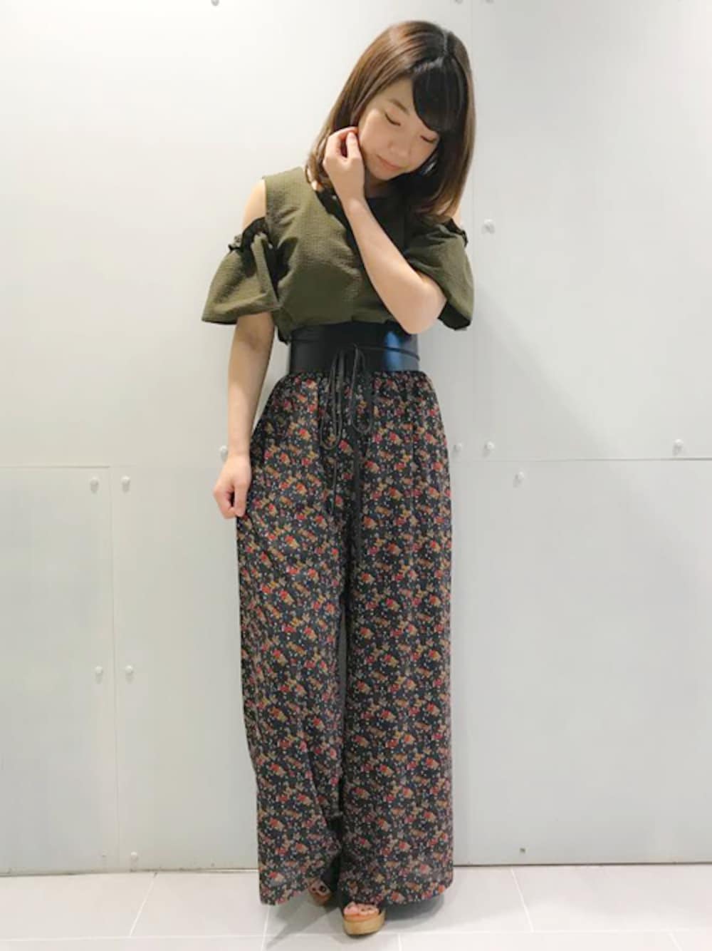 オフショルダーのブラウスとワイドパンツで、トレンドを取り入れたリラックスコーディネート。