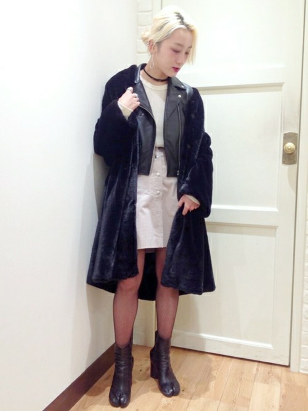 フロントボタンが可愛いスカート。 ミニ丈には、ライダース・ファーコートの辛めのアイテムで。