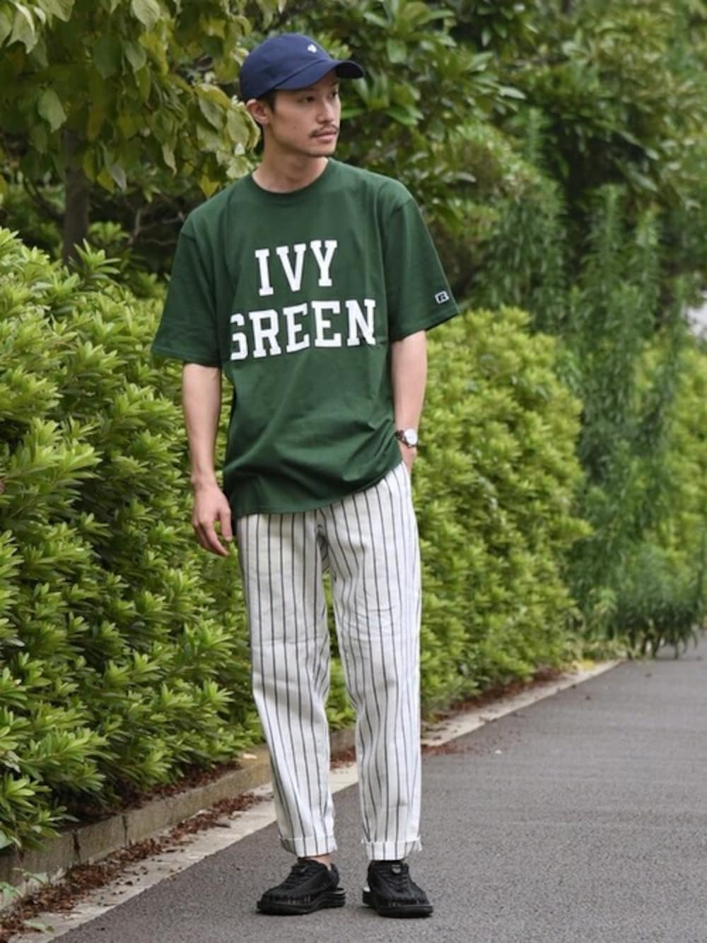 ラフなデザインのカレッジロゴTシャツに上品なストライプパンツを合わせたコーデ。 【着用レビュー】 着用アイテム:Tシャツ 身長:170cm/体重:52kg/体型:やせ型/普段サイズ:M/着用サイズ:XL サイズ感:スタンダードなサイズ感。あえてゆったりサイズを着用。 素材感:ドライタッチな感触の天竺。 着心地:アームホールに程よくゆとりがあり、動きやすいです。 着用アイテム:パンツ 身長:170cm/体重:52kg/体型:やせ型/普段サイズ:M/着用サイズ:M サイズ感:ややゆとりのあるテーパードシルエット。 素材感:程よくハリがあり、光沢のある綺麗めな印象の生地感。 着心地:ストレッチが利いており、リラックスして穿いていただけます。 着用アイテム:サンダル 身長:170cm/体重:52kg/体型:やせ型/普段サイズ:26cm/着用サイズ:9 幅:普通 甲:普通