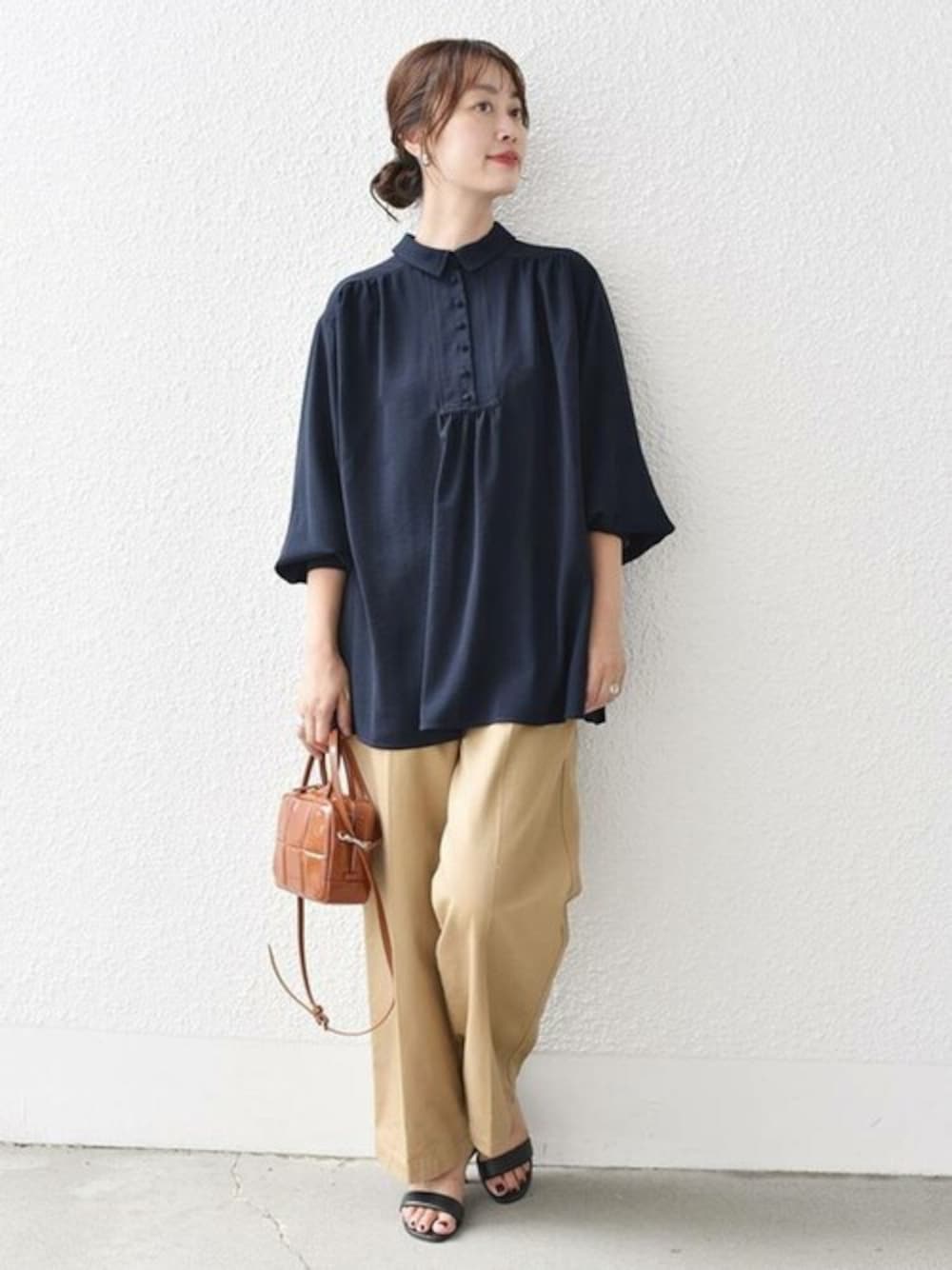 バックプリーツが素敵なブラウス。ストレッチの効いた素材で着やすさがありながらも、きちんと見えするデザイン。 ふわっとおなかや腰回りもカバーしてくれるので、スタイルアップも◎です!! チノパンでベーシックに合わせました。 ------------------------------------- 【着用レビュー】 着用アイテム:ブラウス 身長162cm / 普段サイズ:38・Mサイズ / 着用サイズ:Mサイズ サイズ感:ゆったりと窮屈感なく着れました。丈はヒップにかかるくらい。 コメント:パンツやスカートの上からふわっと着るのが可愛いです! -------------------------------------
