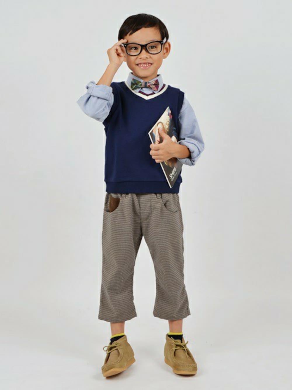 裏毛Vネックベスト+オックスフォードシャツ! 蝶ネクタイやメガネ、ブーツなどの小物使いでカジュアルにもキレイめスタイルにも☆ 発表会やちょっとしたお出掛けに!