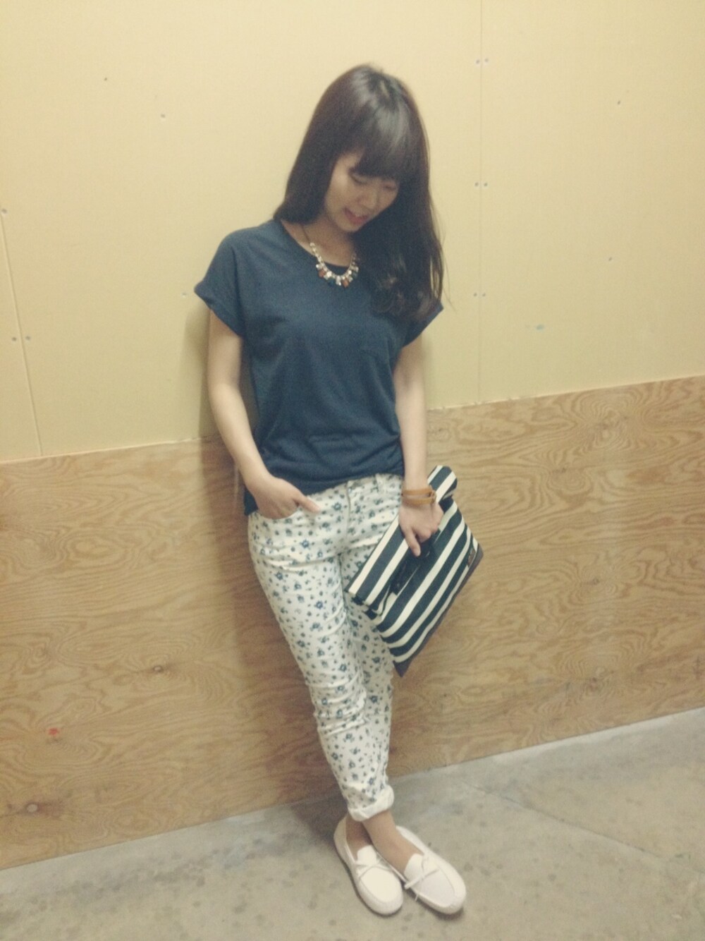 Tシャツ:SPAO 【¥941+税】 フラワーパンツ:SPAO 【¥3,791+税】 バッグ:SPAO 【¥1,891+税】 シューズ:SPAO 【¥1,416+税】 小花柄のパンツが春らしい印象を与えてくれます♡ シンプルなTシャツに合わせることで、大人っぽく♪