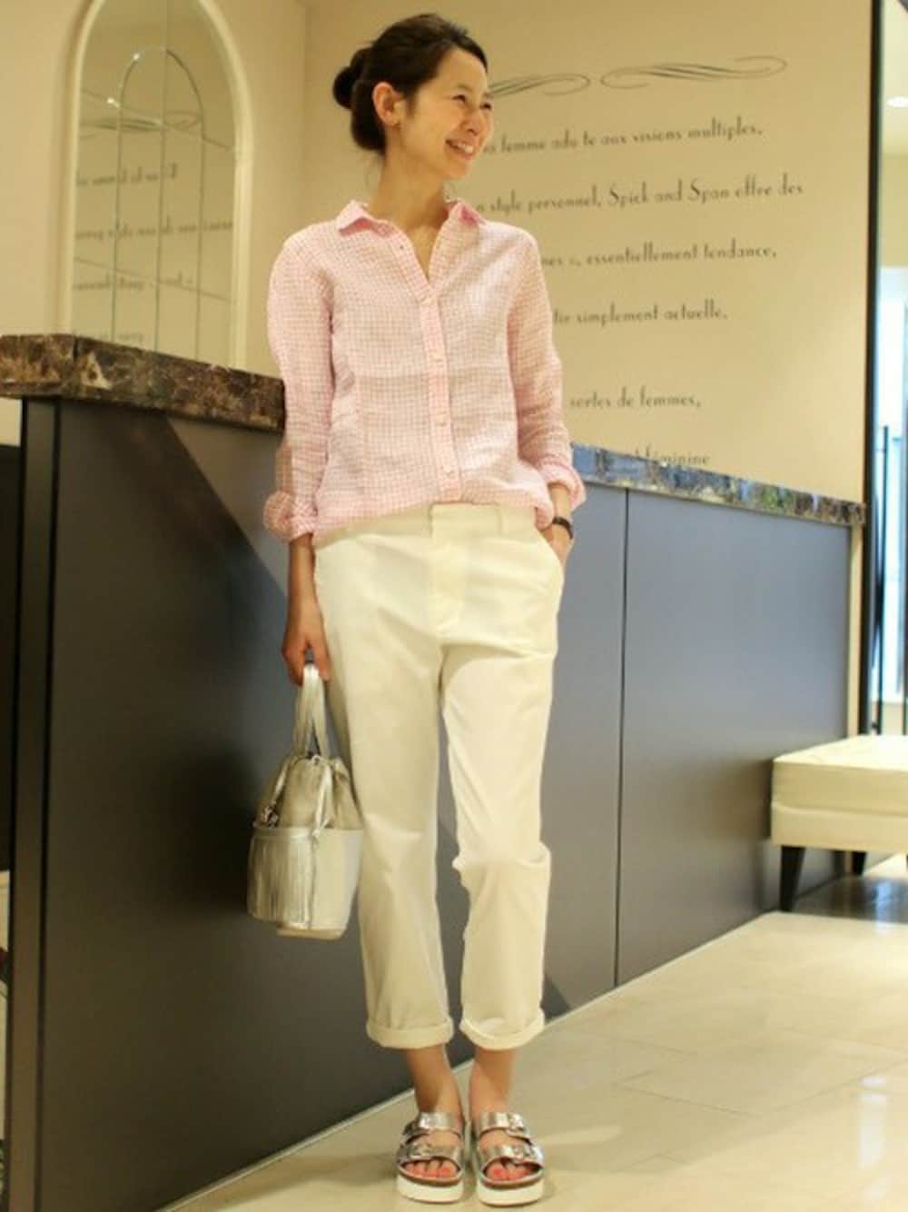 タッターソールのチェックが涼しげな印象のリネンシャツ。 ホワイトボトムとメタリックなGOODSに合わせて軽さを出した着こなしに。