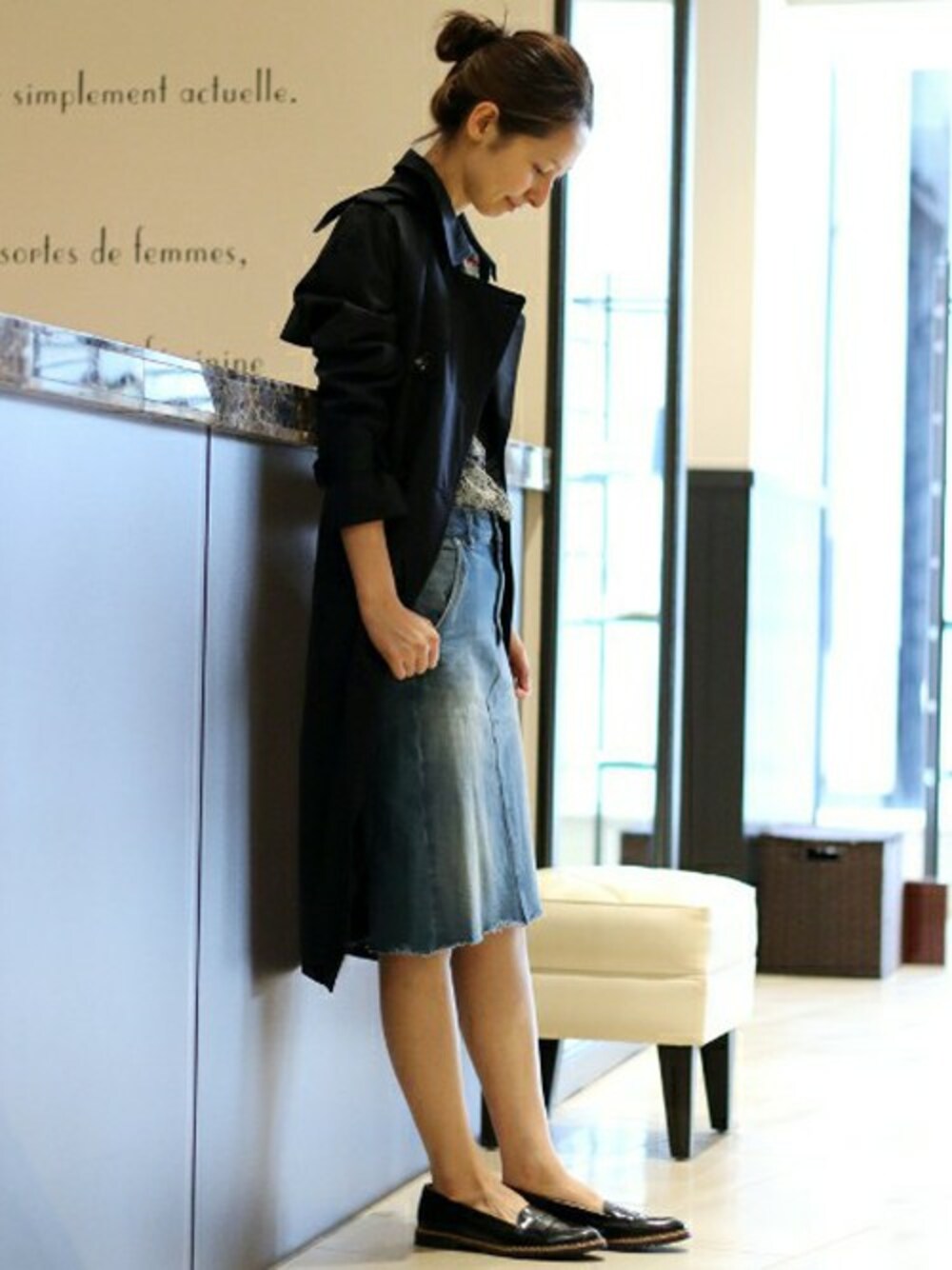 ☆ネイビーのワンカラートレンチスタイル ネイビーのトレンチコートをデニムスカートにあわせたワンカラーのグラデーションコーデ! パイソンプリントのブラウスをプラスしヴィンテージ感を出しています。 足元はローファーで抜け感をプラス。
