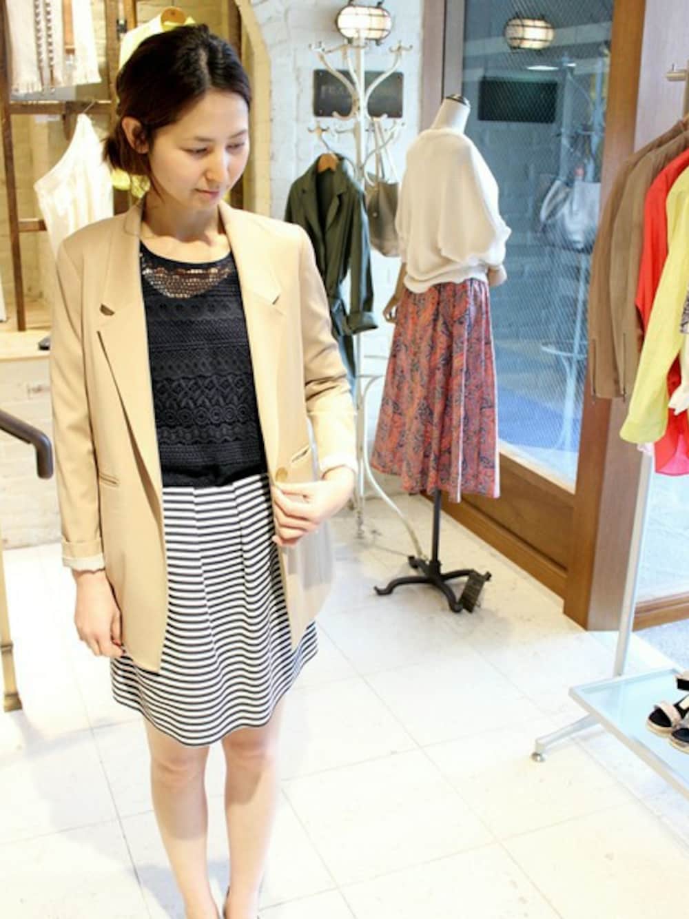 今年もやっぱりレース素材が着たいですね。 ケミカルレースのプルオーバーにボーダーのタックスカートのコーデ♪ トップスをインして、スカートのふんわりシルエットを強調してみました。 シルエットが今年っぽいってわりと重要ポイントですね!