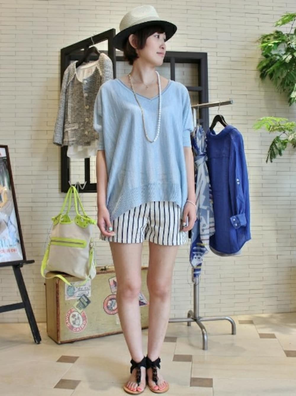ヘムラインと優しいカラー使いのリネンニットを、ストライプのショートパンツに合わせてシルエットを引き立たせました! GOODSにブラックを入れてスタイリングを引き締めています。