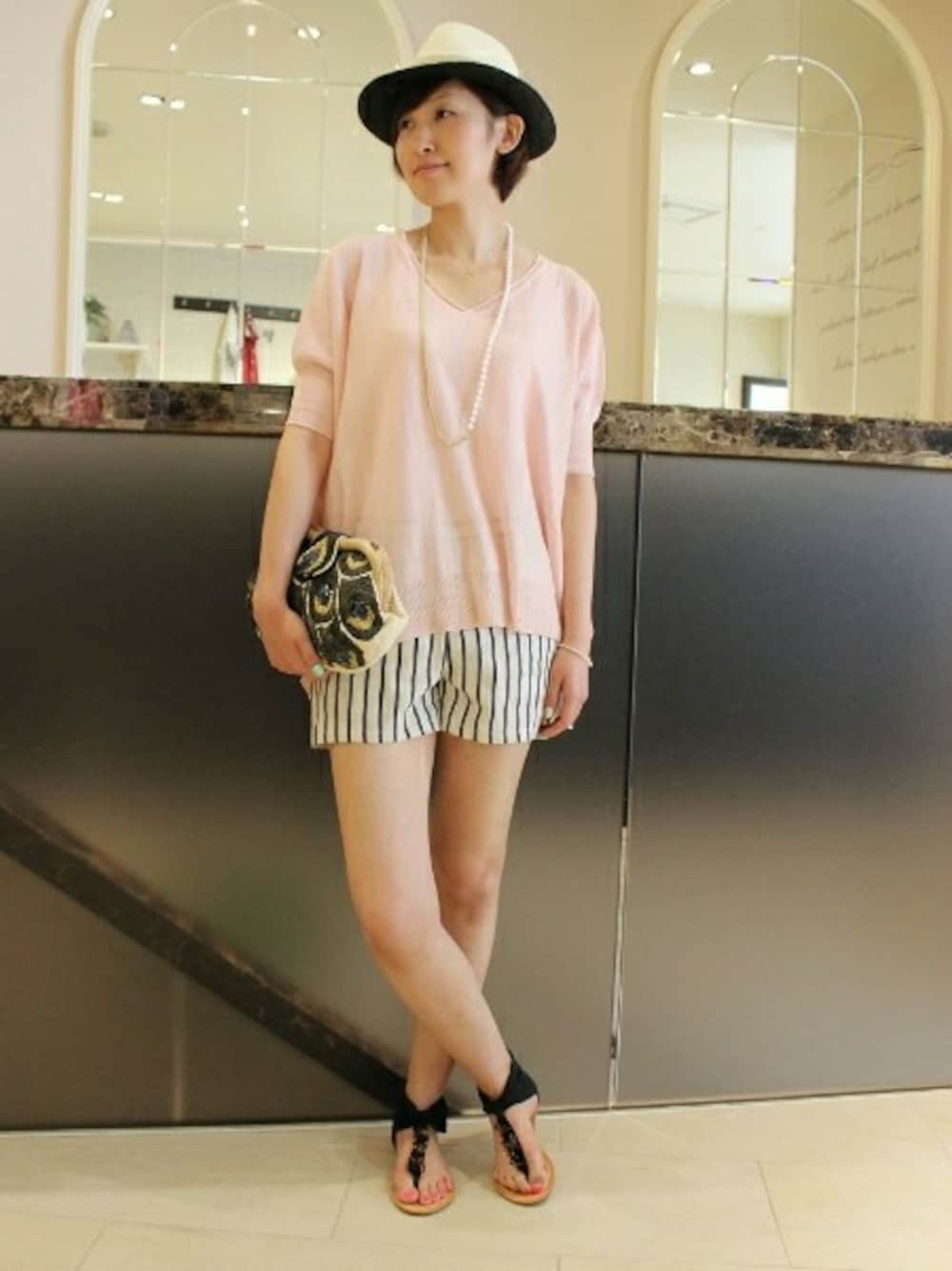 人気のVネックドルマンスリーブのプルオーバー。ホールガーメント仕様でゆるシルエットでも女らしさが漂うニット! リネン混のストライプのショートパンツをプラスで大人の初夏スタイルにぴったり。