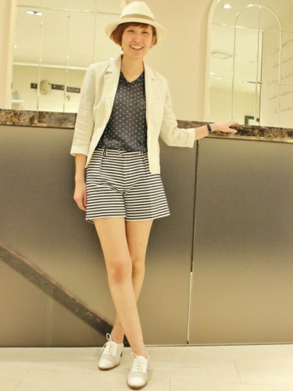 120%LINOのテーラードジャケットにイカリ柄のカットソーを合わせた、遊びの効いたスタイリング。、ジャケットの美しいシルエットをポイントに、程よくリラックス感を出してこなれた印象に仕上げています。