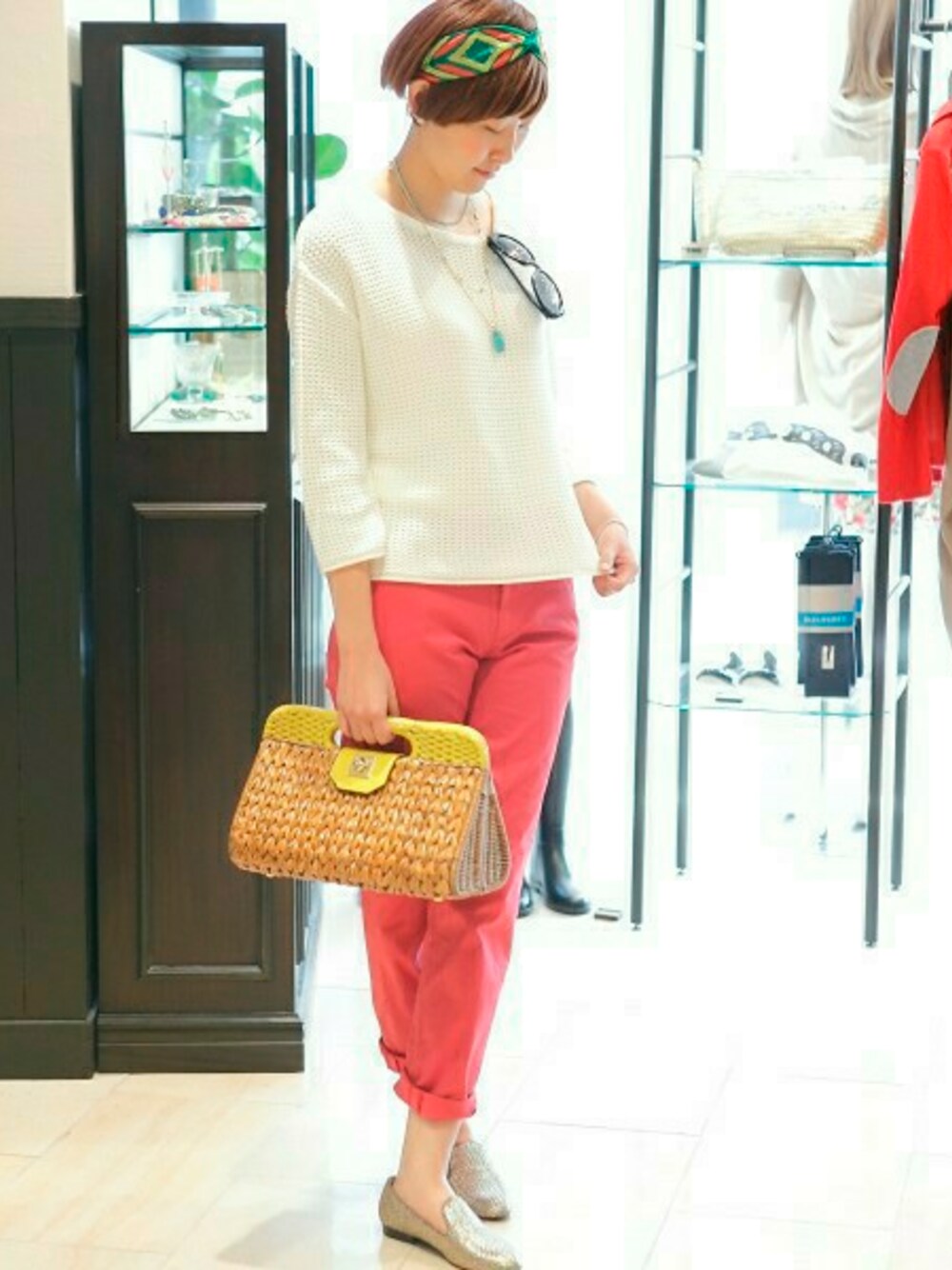 ホットピンクのパンツ×ターコイズアクセが新鮮な、リゾートなイメージも漂います。ホワイトのニットで清潔感もプラス。GOODS使いにこだわりを出し、ワンランク上のリラクシングスタイルの完成です。
