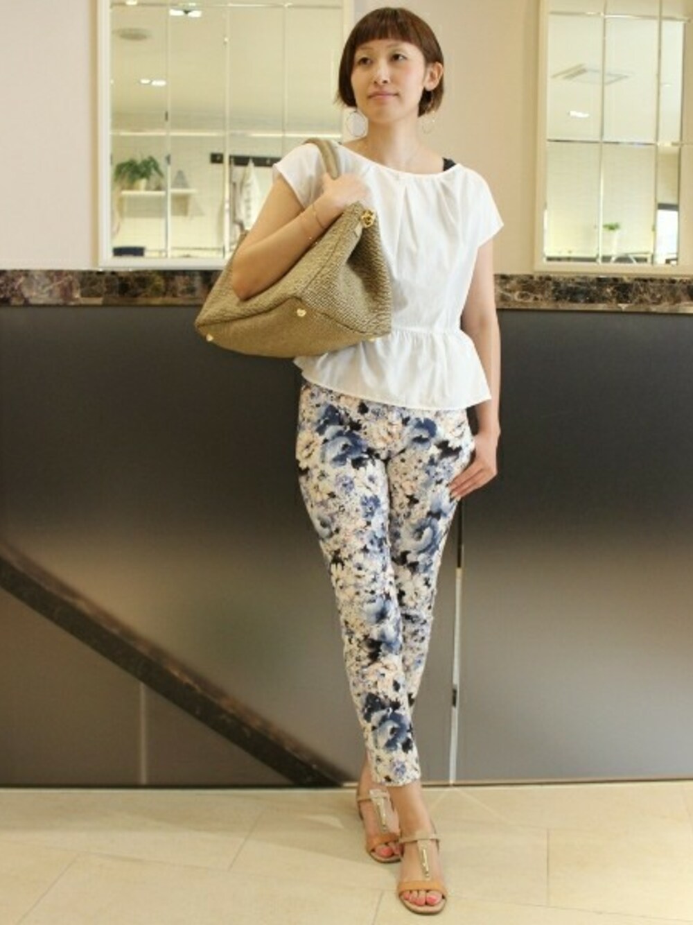 花柄のサブリナパンツ&ぺプラムブラウスのトレンドアイテムを、大人っぽい色味でスタイリングしました。 GOODSのカラーはベージュにして、柔らかい印象にしています。