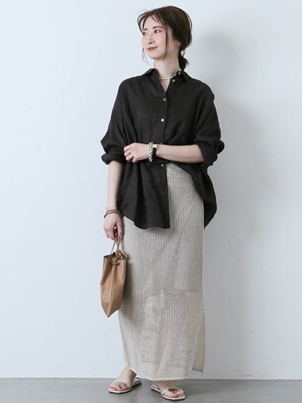 人気のリネンシャツのnewカラーはブラウンがオススメです! 光が当たると少し透けるような素材感で、ゴールドの釦もアクセントになります。 メッシュスカートとワントーンで、お休みの日におすすめなコーデです。