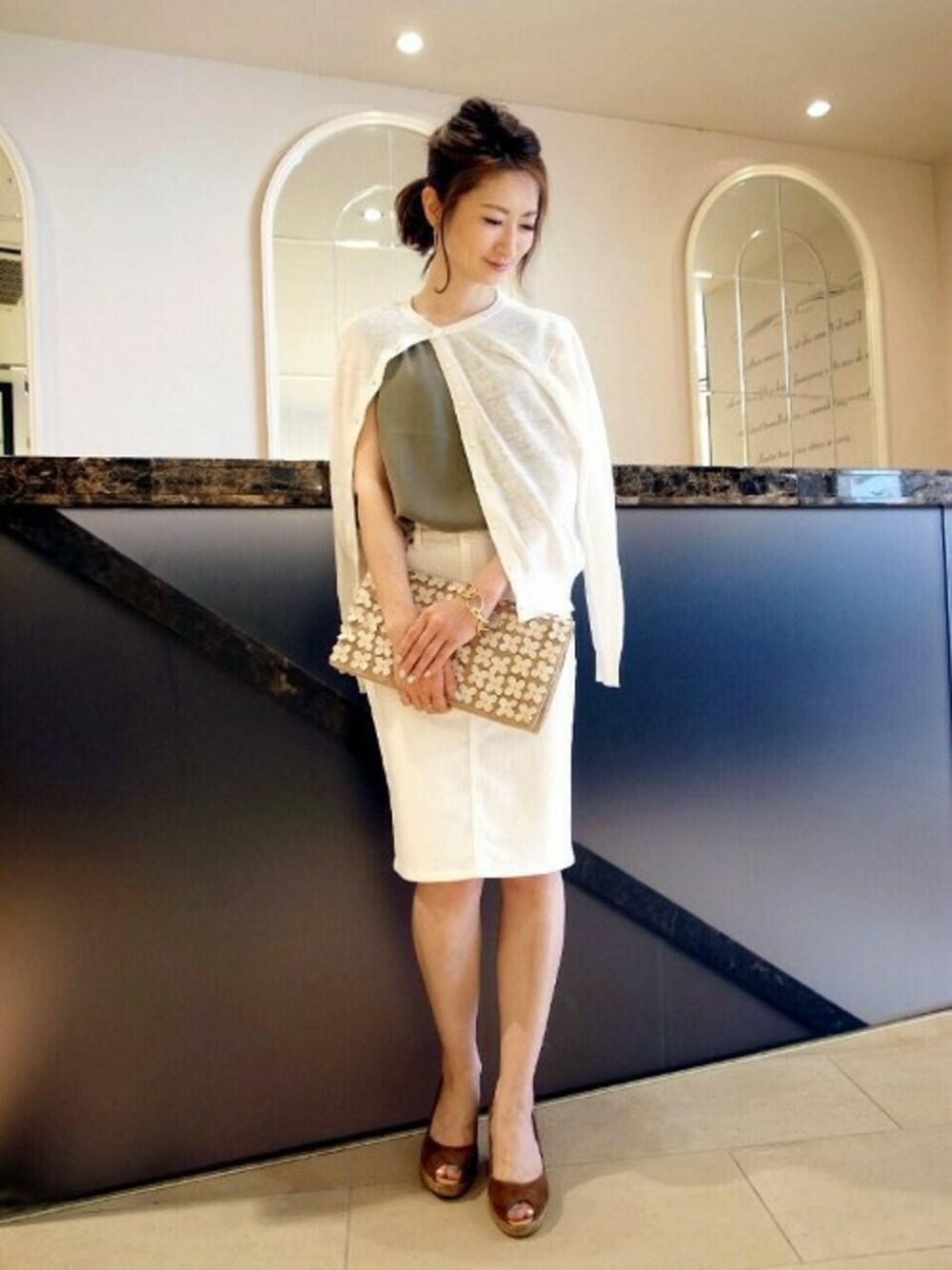 軽やかなホワイトニット×ホワイトデニムを合わせた”白”を主役にしたコーディネート。 シフォンブラウスをプラスして大人っぽく仕上げて! フラワークラッチでキュートな遊び心も忘れずに。