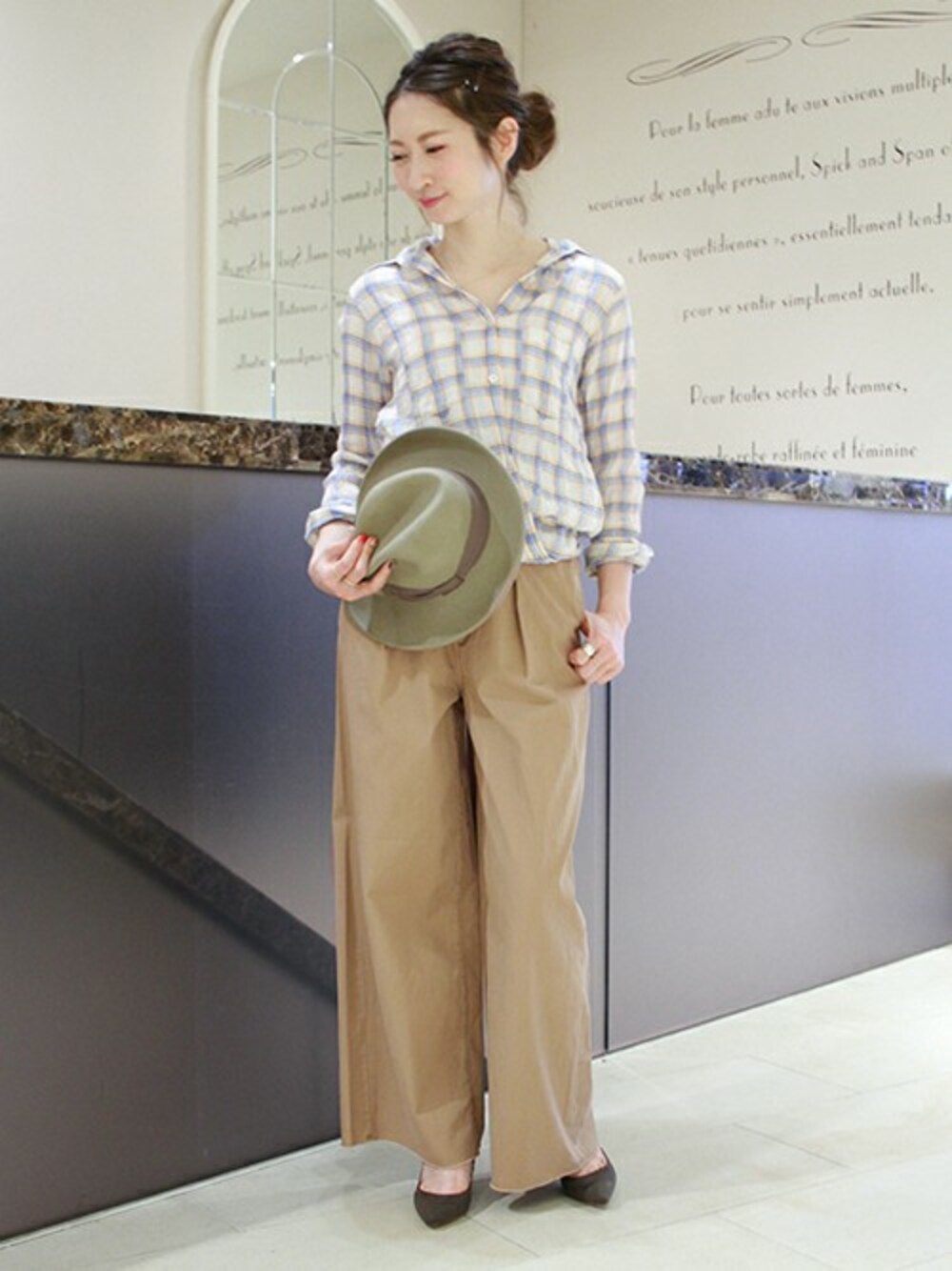 春のカジュアルスタイル ウエストのディティールはスッキリさせたワイドパンツに、同系色のチェックを合わせて どこかサファリシックな雰囲気に仕上げました♪