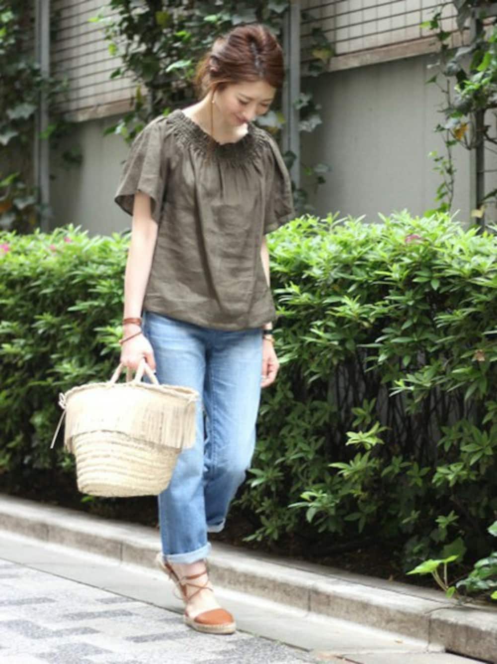 ☆休日スタイル 深みのあるカーキのブラウスは、デニム合わせでカジュアルに。