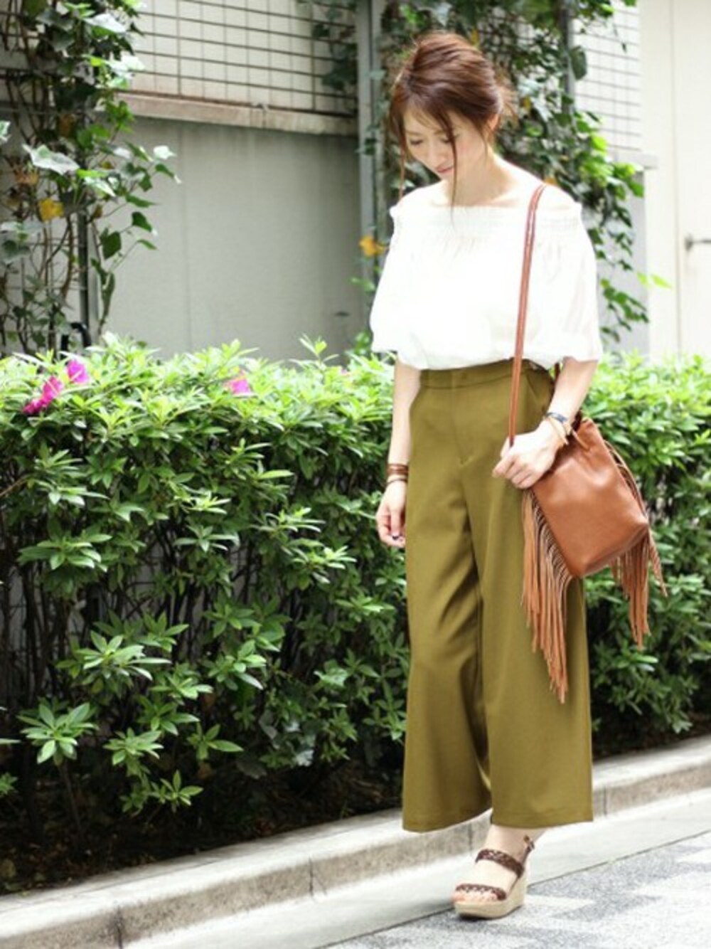 ☆オトナカジュアルスタイル 涼しげなリネンオックスブラウスをカーキのボトムスと合わせたカジュアルスタイルに。