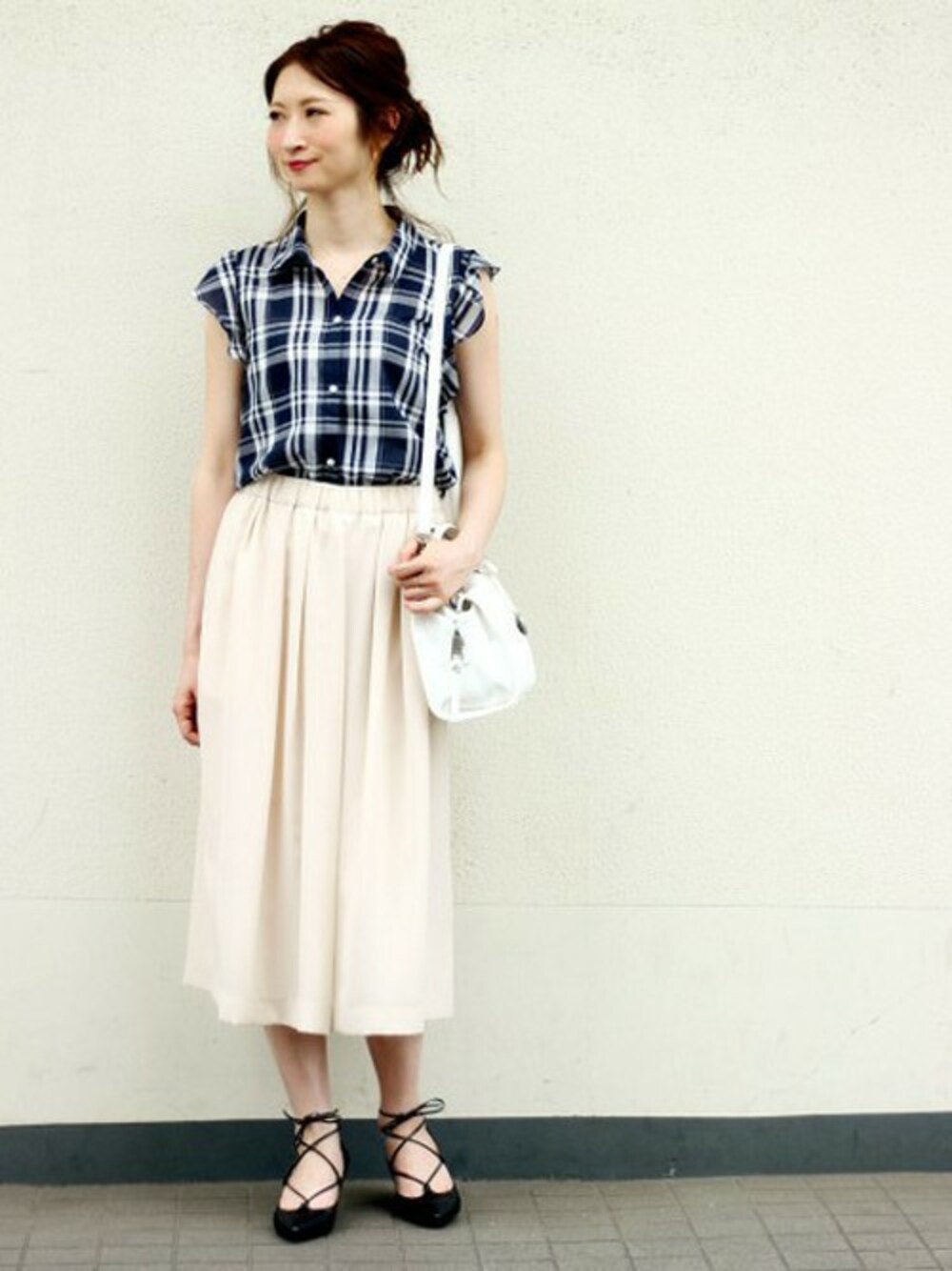 大人気スカウチョが新色も加わり登場! チェックブラウスとレースアップシューズで女子らしいスタイルに。