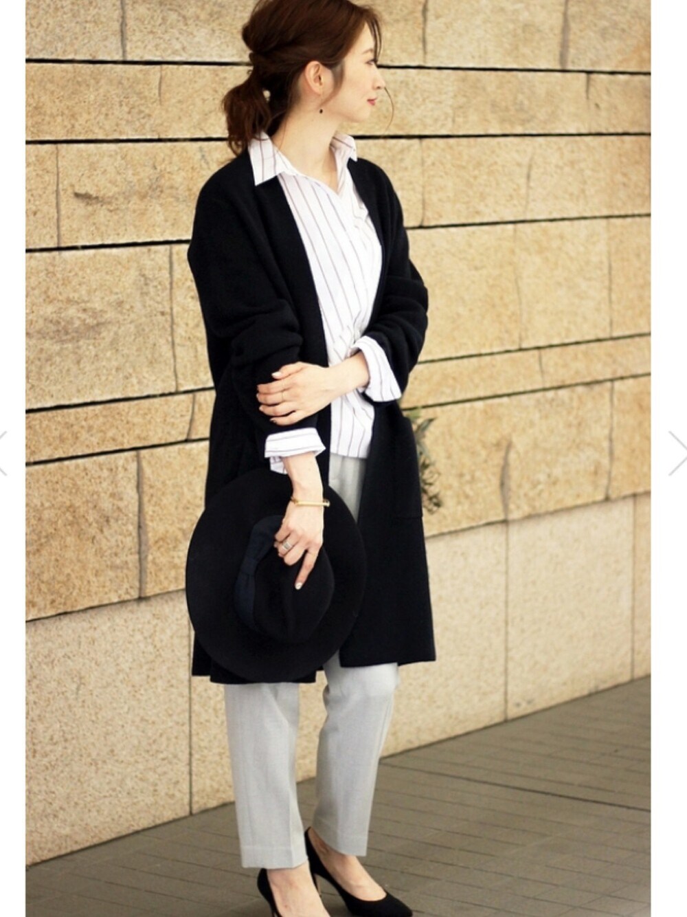 ☆シャツスタイル ネイビーのロングカーデのインには、今年らしいキャメルをチョイス。 綺麗めなパンツスタイルも、色使いで今年らしく仕上がります。