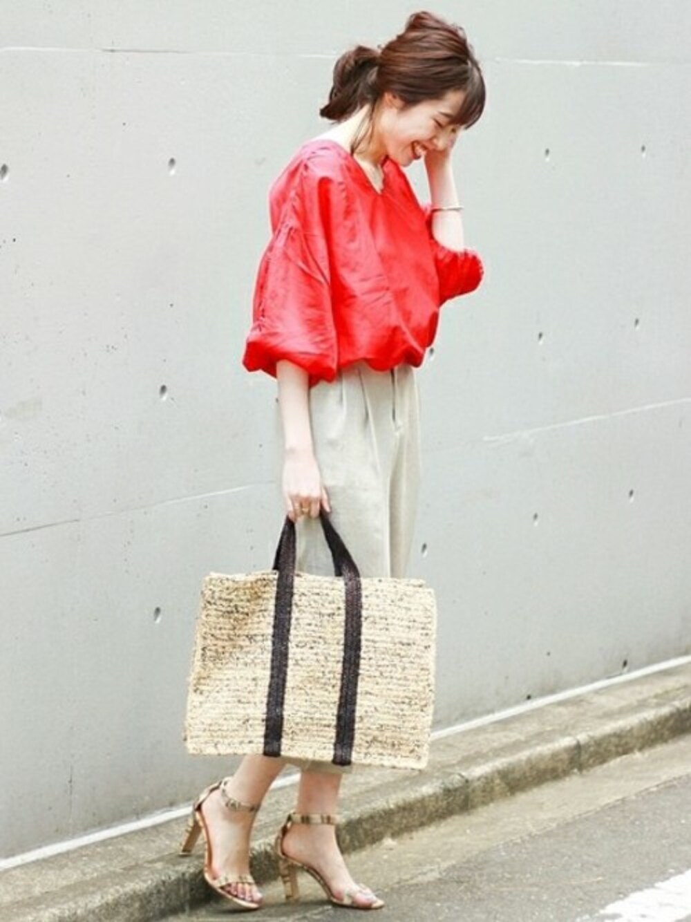 トレンドの刺繍ブラウスは、ビビットなレッドで華やかな印象に。タックパンツと合わせて大人の女性におすすめな休日スタイル。
