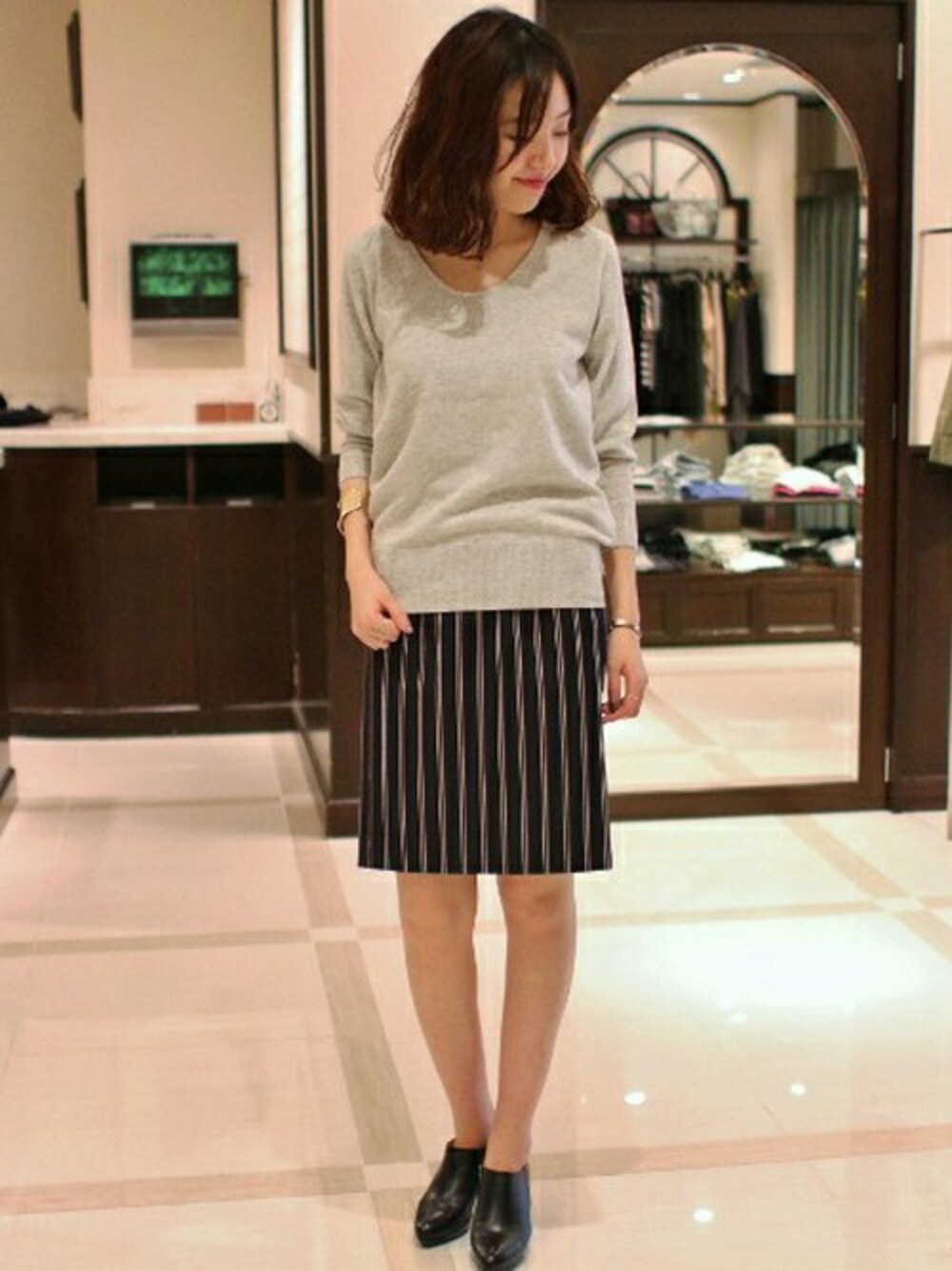ソフトな風合いで、シルエットがリラクジングなカシミアライクなVネックプルオーバー。 マニッシュなレジメン風ストライプなスカートとの相性もピッタリ。