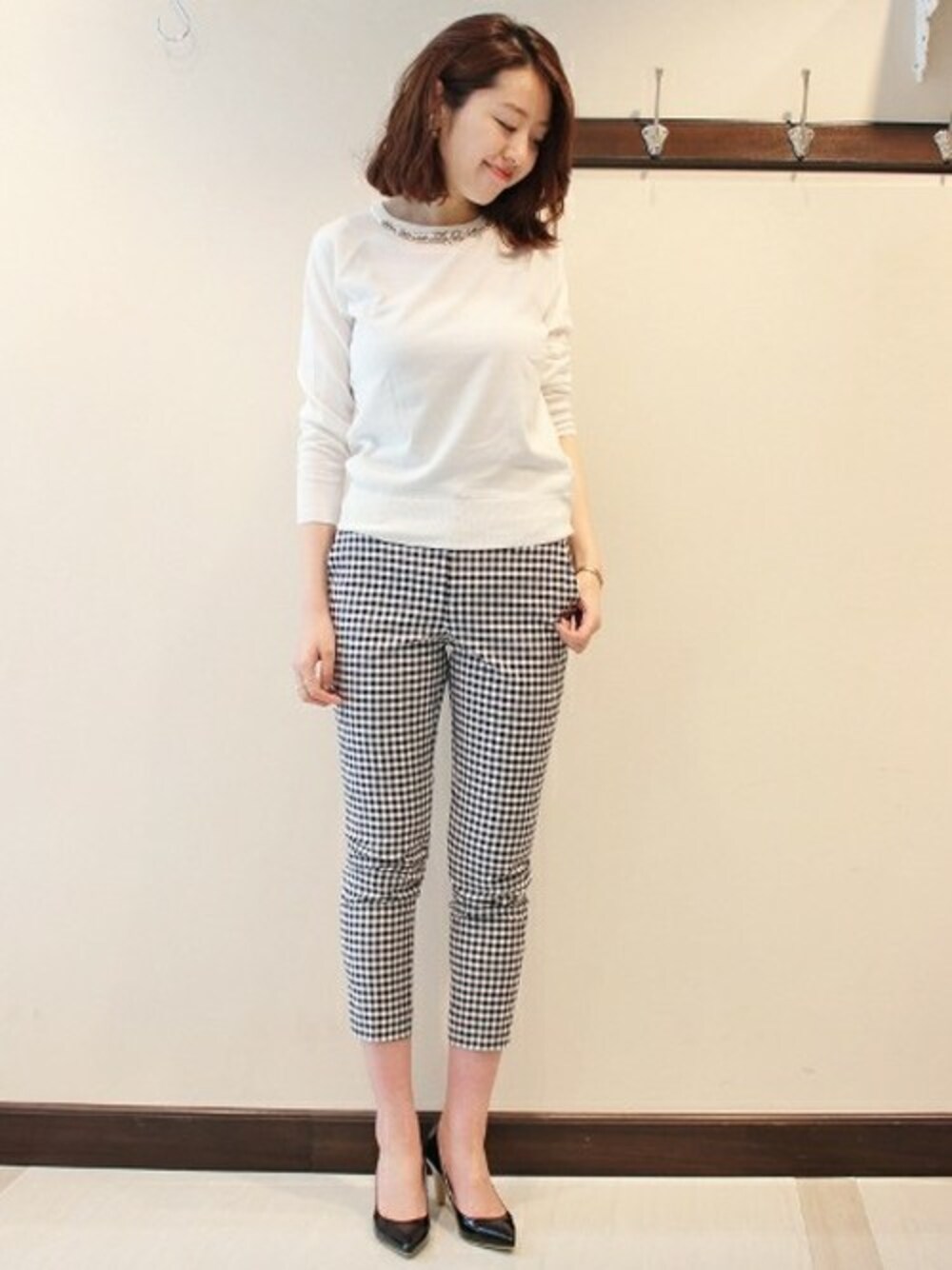 ビジューを施したエレガントな印象のニットはネックレスのような感覚。ギンガムサブリナとパンプスでお仕事スタイルにもぴったり。