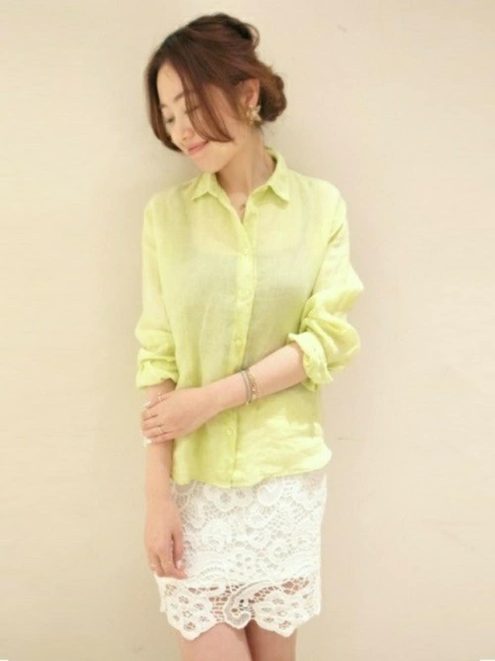 リネン素材のベーシックなレギュラーシャツは鮮やかなカラーがポイント! 顔周りをぐっと明るくし、涼しげな印象に仕上げてくれます。 レースのスカートとは相性ピッタリですよ♪