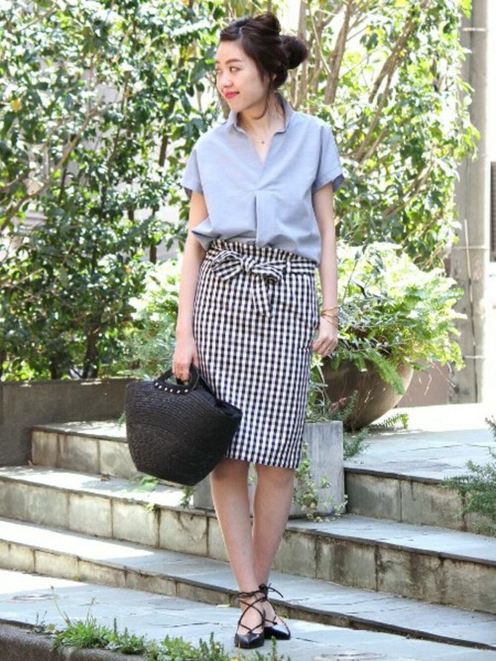さわやかなブルーのブラウスにギンガムスカートを合わせて初夏を感じるスタイルに。
