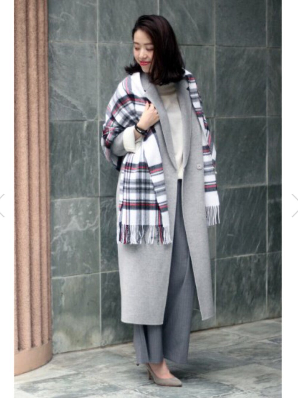 JoshuaEllisに別注をかけたチェック柄ストール。 グレーのワントーンコーデにプラスで決まり。