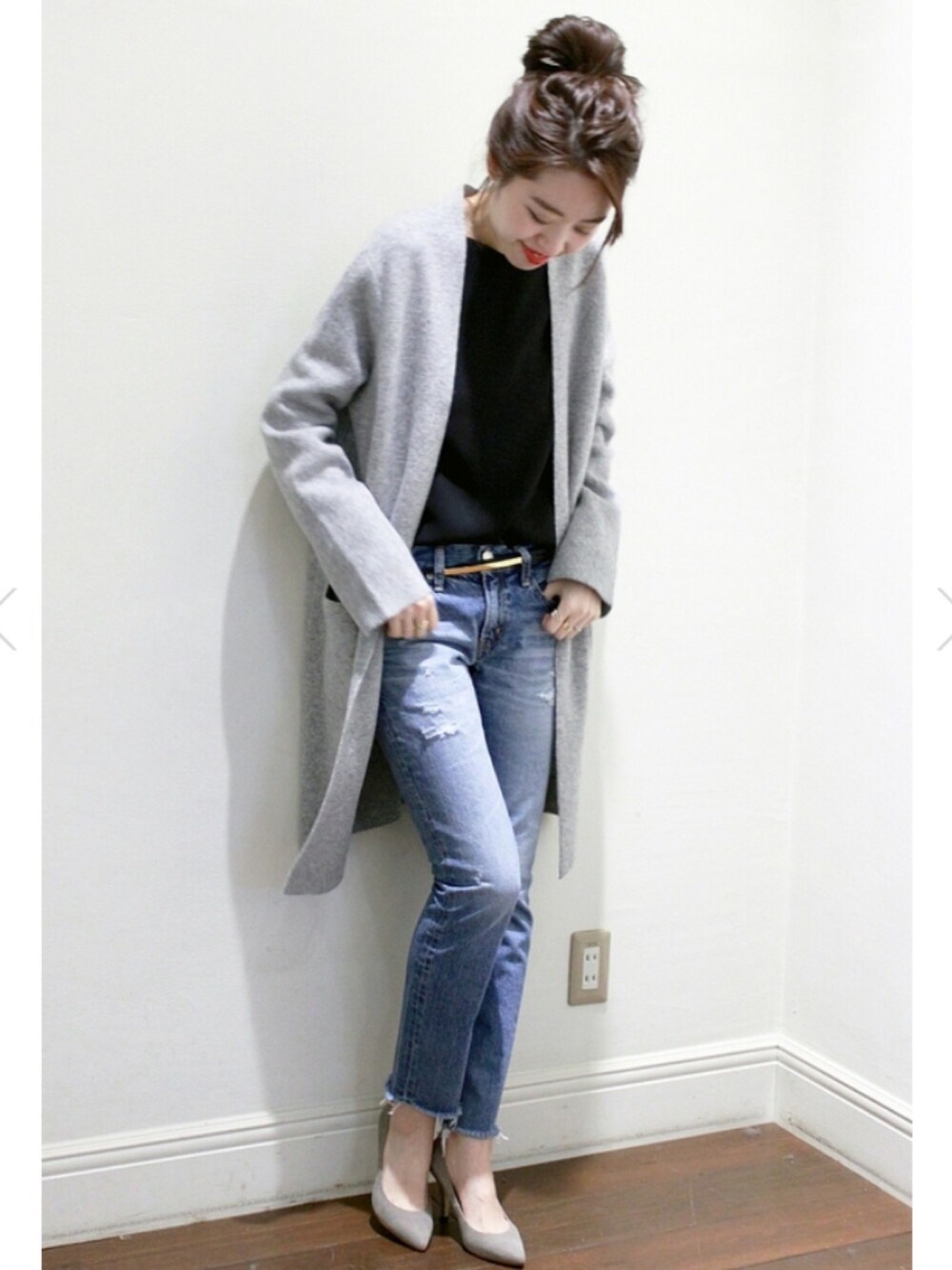 今時期にぴったりなコーディガン。 ほどよい厚みのベーシックなコーディガン。 いつものデニムスタイルを一気に旬顔にアップデート! ゴールドのプレートベルトがアクセントに。