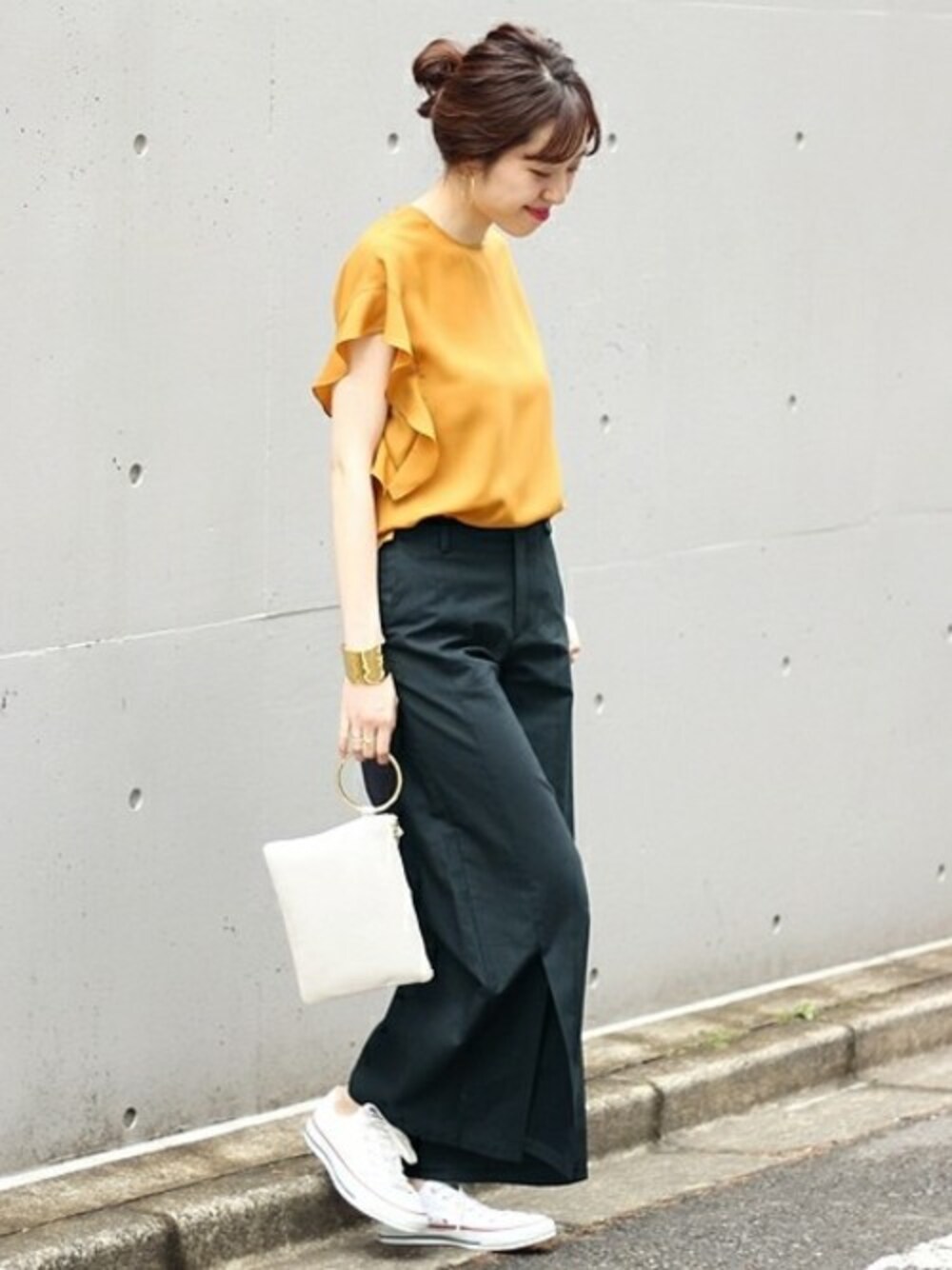 鮮やかなキャメルのフリルブラウス。裾ベンツパンツとスニーカー合わせでカジュアルにスタイリング!顔周りを明るくみせてくれるキャメルは、夏にもぴったりです。