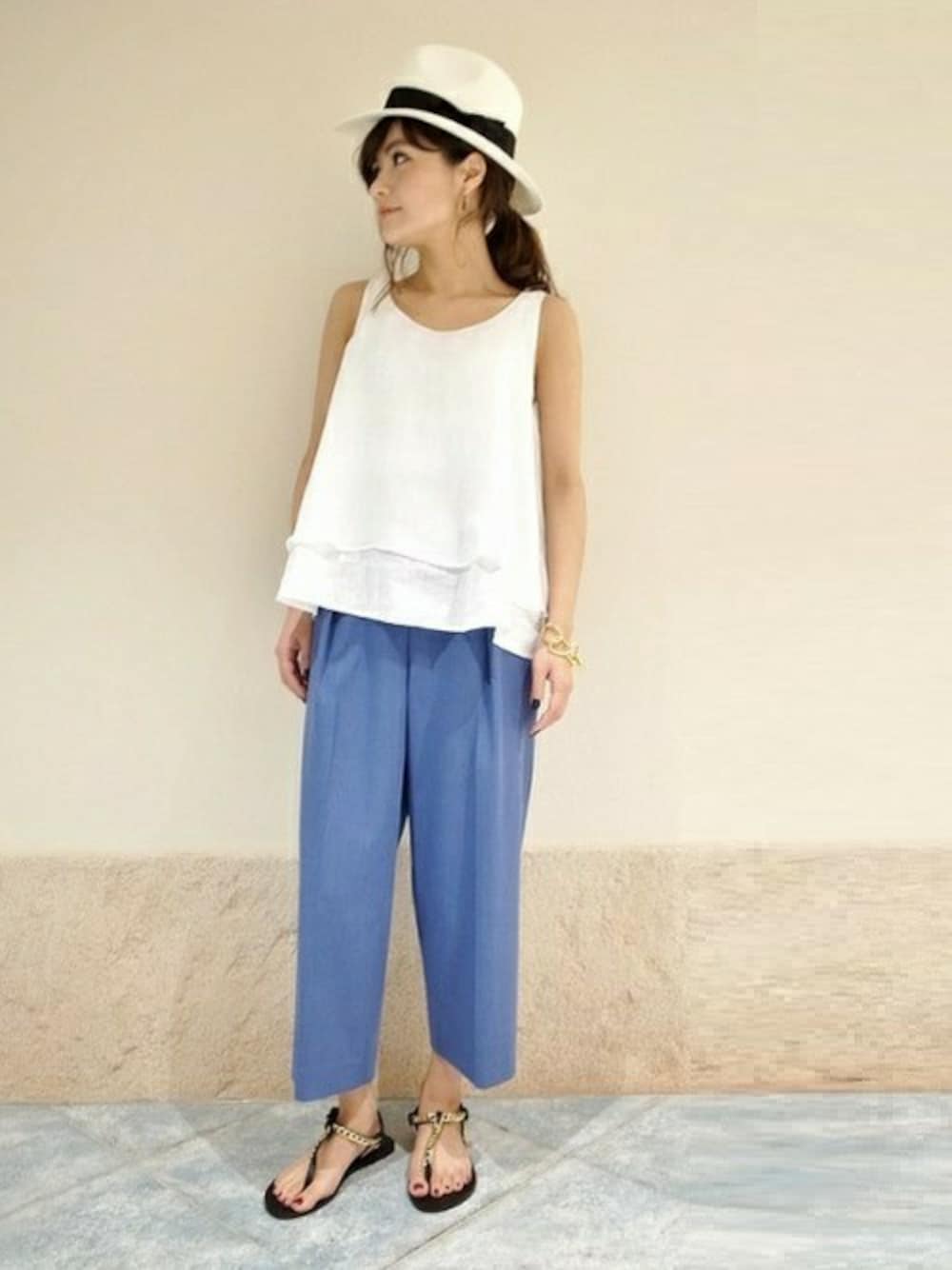 注目のクロップパンツは、スカイブルーをチョイスして初夏っぽくスタイリング! 全体にキメ過ぎずエアリーにまとめて。