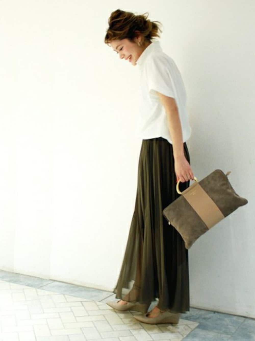 ふんわりと抜け感のあるブラウス。 軽さのあるプリーツスカート合わせて春のお出かけにぴったりなスタイル。 足元はレースアップシューズでトレンド感をプラスして。