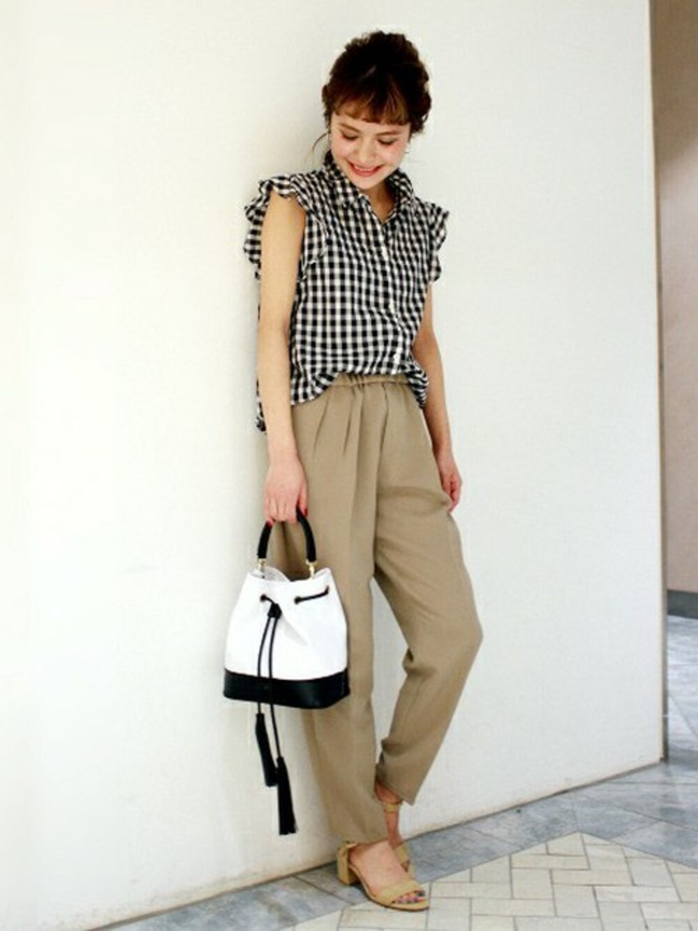 おすすめギンガムチェックブラウス 一枚で存在感抜群のブラウスは、ジョッパーズと合わせてオフィスにもおすすめスタイル。