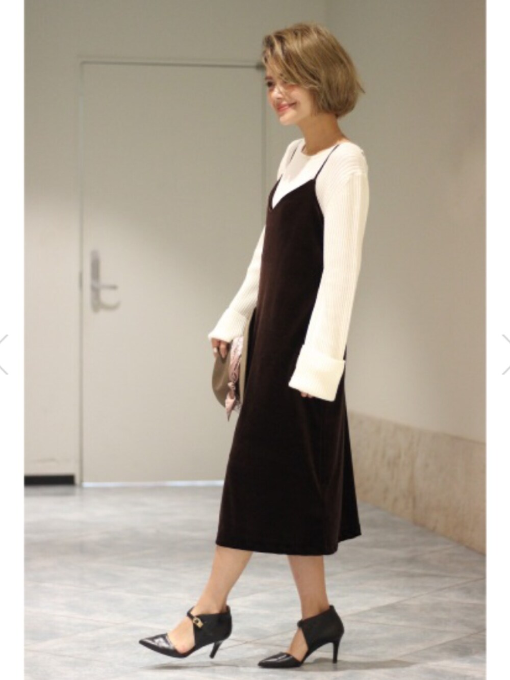 今年旬なベロアキャミワンピをリブニットとレイヤードで。ヒールでオトナめだけど少しラフに着るのが今の気分。