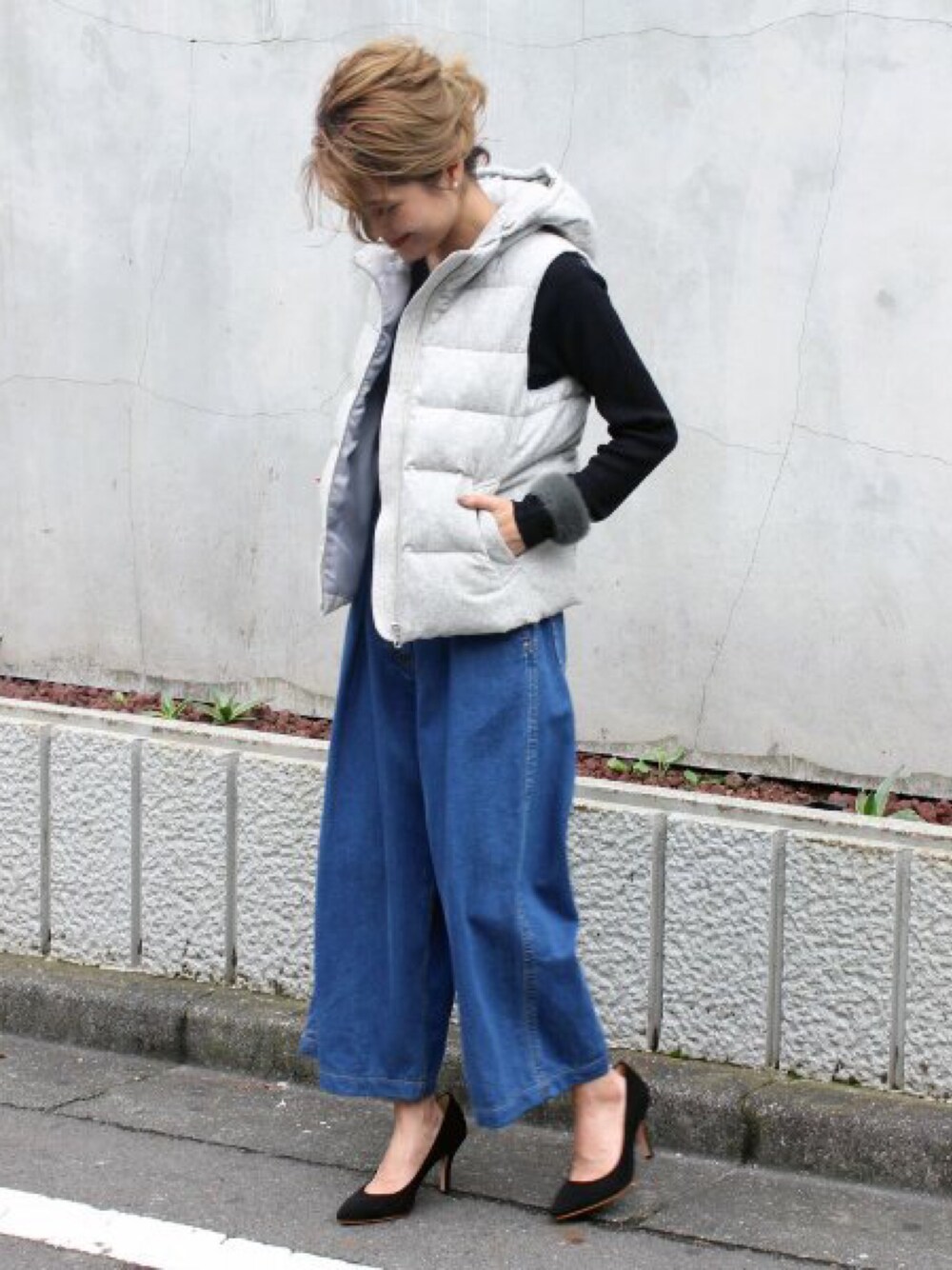 ライトグレーのダウンベストはカジュアルにワイドデニムでヒールをプラス。