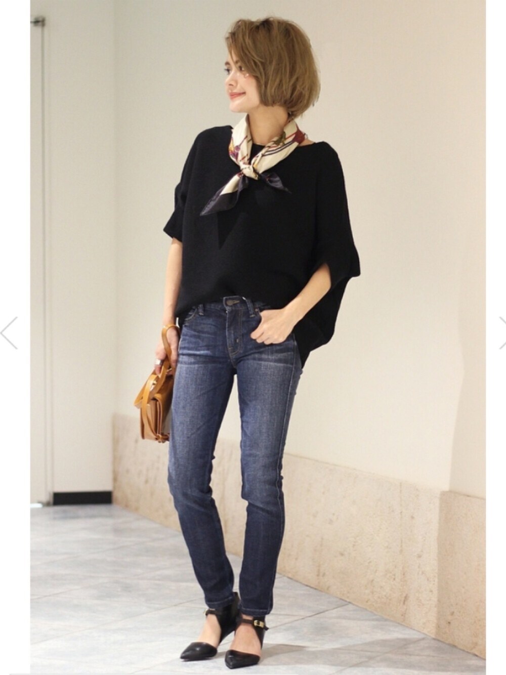 デニムスタイル☆ ユニークなデザインが人気の変形シルエットは、スキニーデニムと合わせてシルエットを楽しんだスタイルに。 小物使いがアクセント。