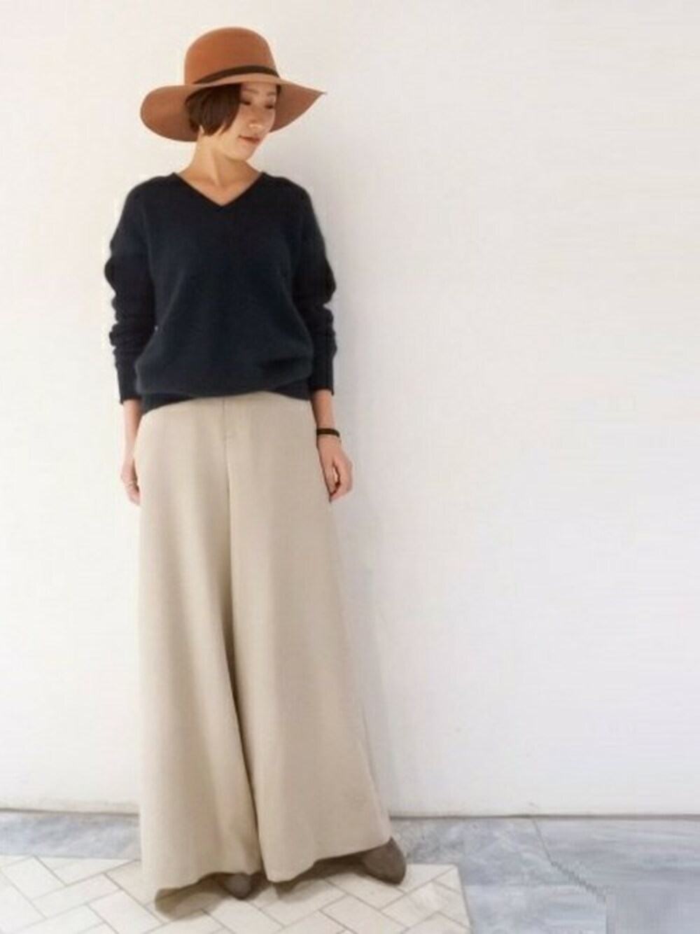 ベーシックなVネックニットには、マキシフレアパンツを合わせて。 つば広HATでポイントをプラスして女らしくまとめました。