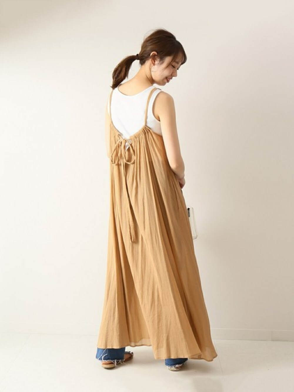 ◇人気モデル武智志穂さん×Spick & Spanのコラボレーションアイテム! 華奢なストラップとバックデザインが華やかさを纏うサマードレス。 甘くなりすぎず大人っぽく着こなせる楊柳素材、合わせるインナーで雰囲気を変えてコーディネートを楽しめるキャミソールデザイン。