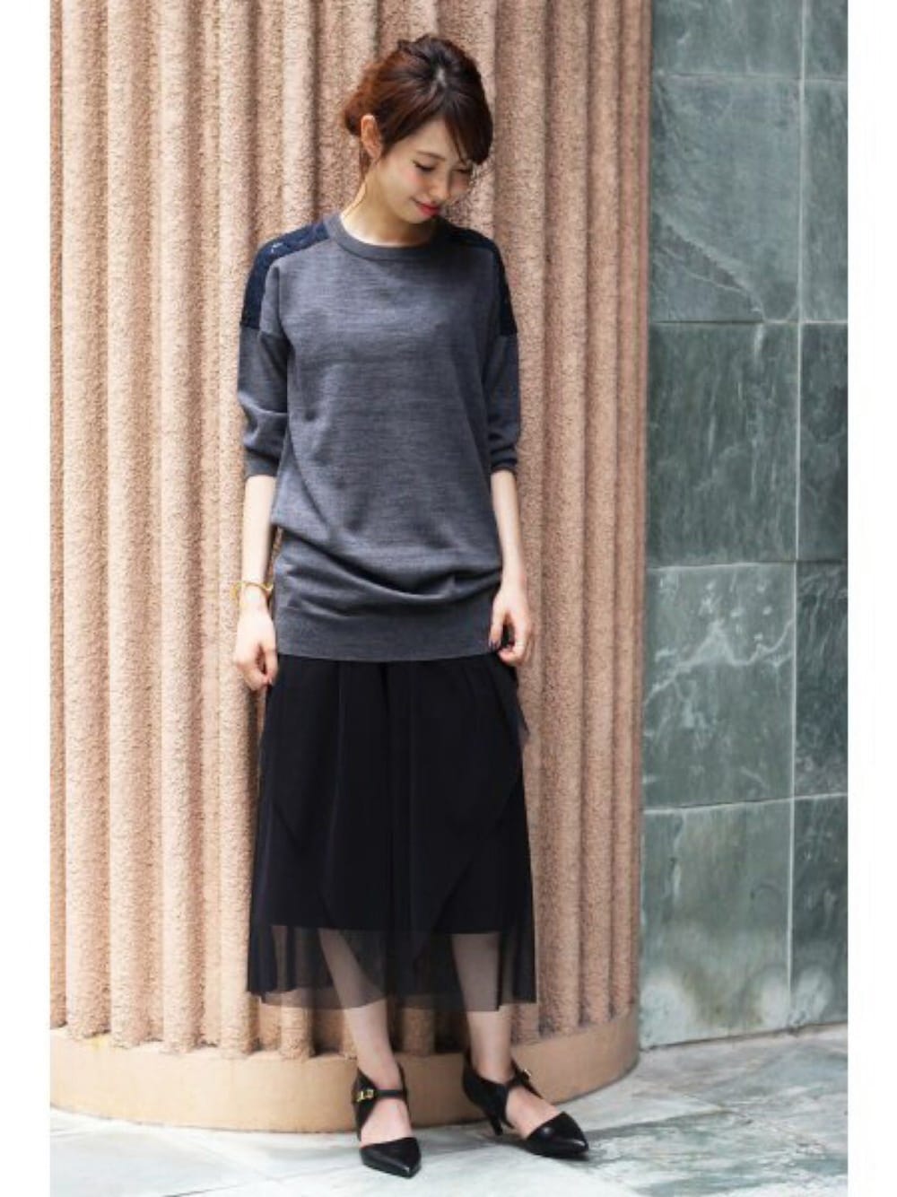 追加予約受付中!レクラのレースニット。 肩レースがオトナのかわいらしさを演出。 足元はヒール合わせが◎