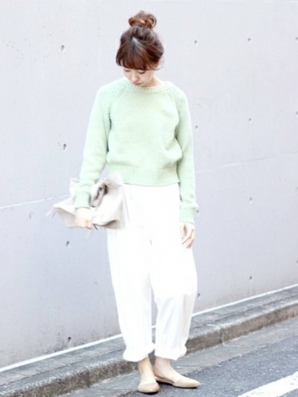 春カラーニット。 カラーニットは、白いチノに合わせてカジュアルに。