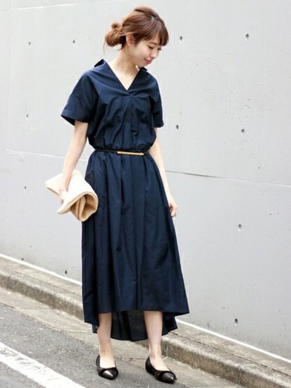 ☆ワンピーススタイル シックなネイビーは、小物使いでポイントを。 動きのあるヘムラインが女性らしさを演出してくれますよ。