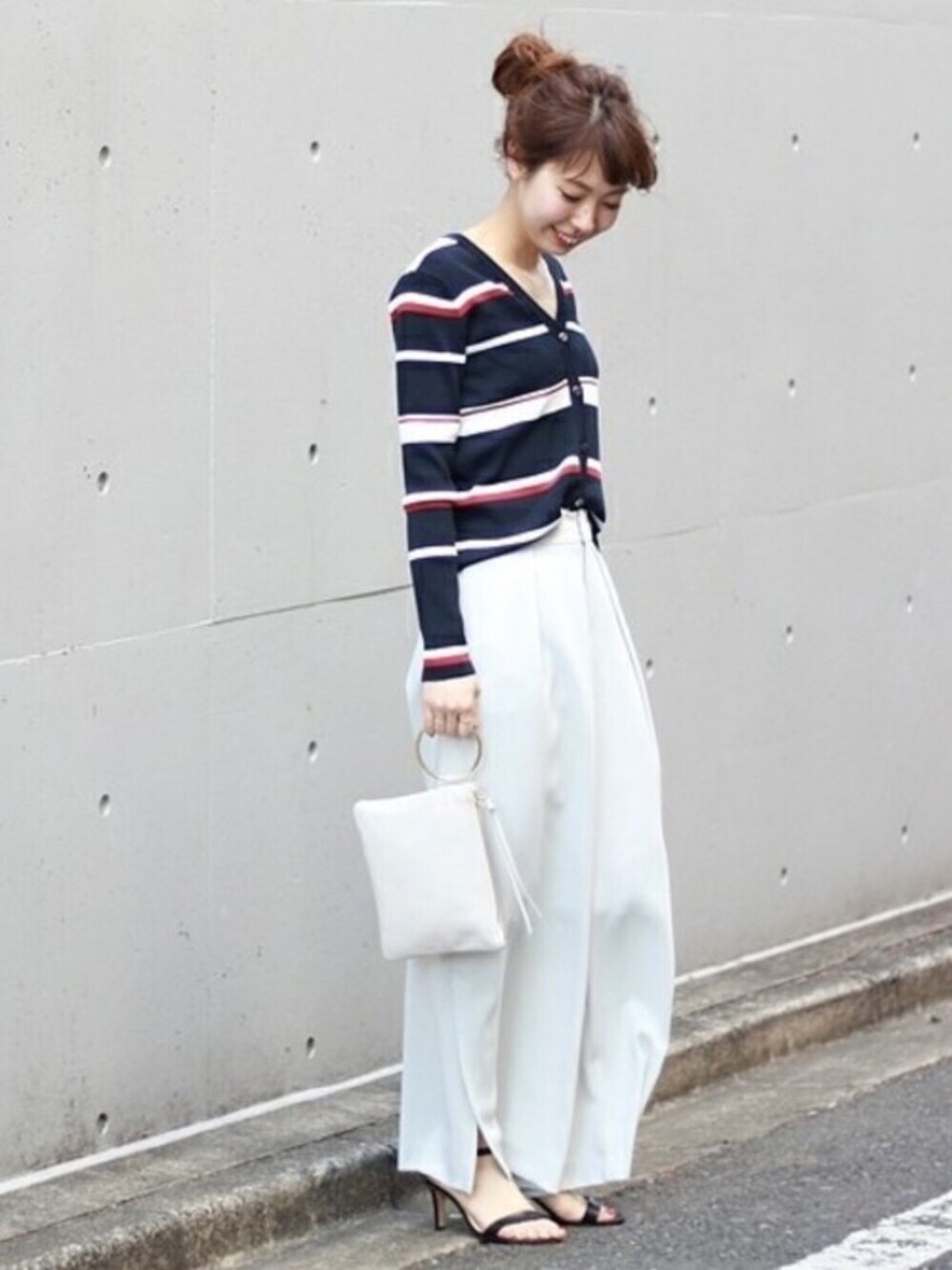 ☆マルチボーダーカーデ この春カーディガンは、ボタンをとめて着こなすのが気分。サイドスリットパンツで、女性らしい抜け感をプラスして。
