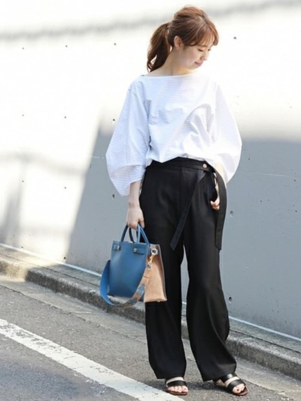 シャーリングブラウス ボリュームスリーブブラウスをシックなパンツで合わせて少しモードな印象に。春らしいブルーのバッグがアクセント。