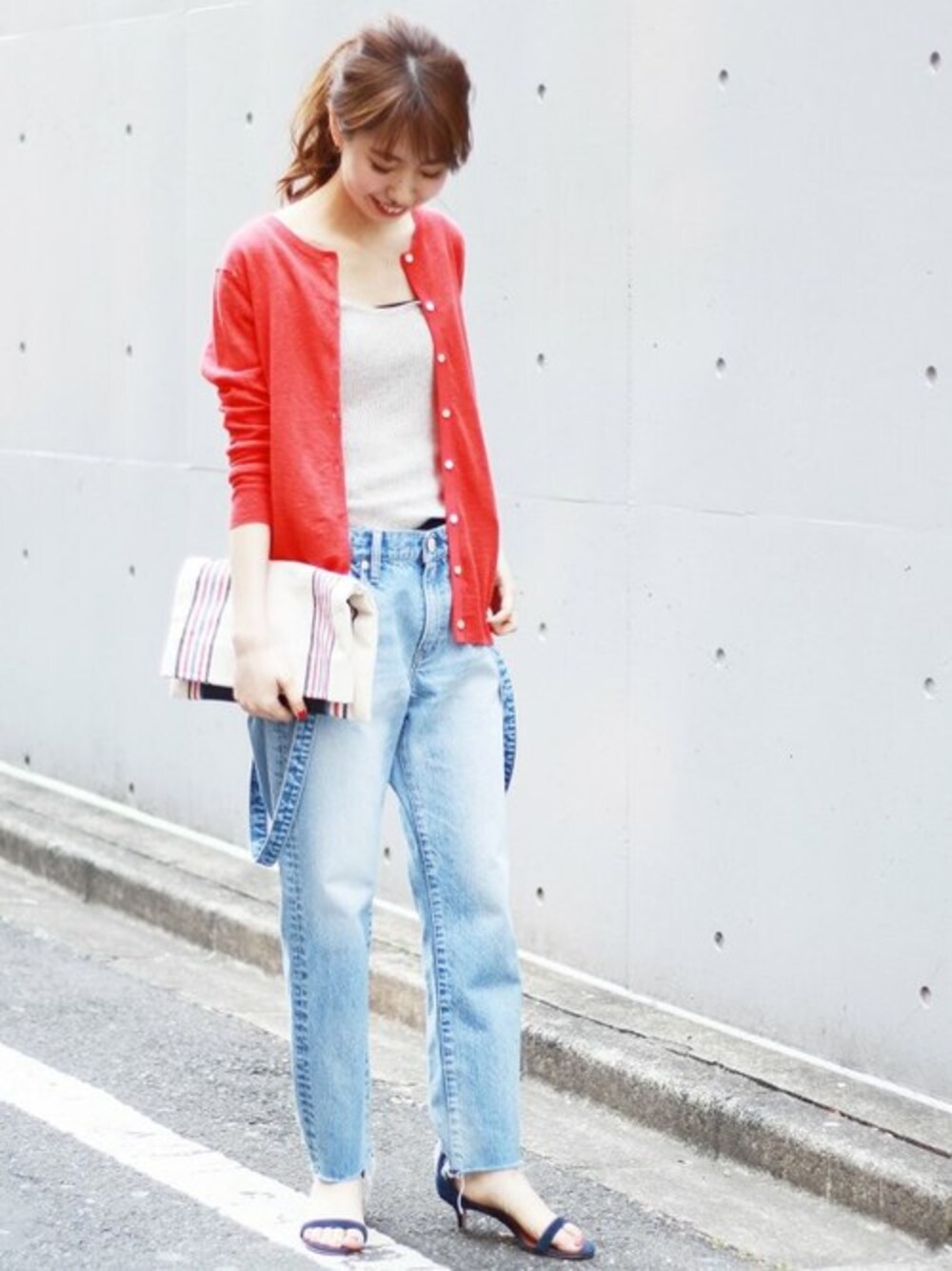 トマトレッドのカーディガン 夏に向けてもおすすめのリネンカーデ!今シーズン注目のトマトレッドは、いつものデニムスタイルをぐっと華やかに仕上げてくれますよ。さりげなく小物のカラーもリンクさせてまとまった印象に。