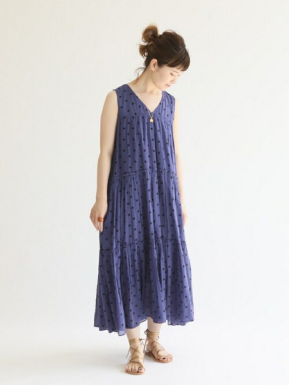 ブルードットが珍しい、【ne Quittez pas】 別注ドットマキシワンピースは、 しなやかに揺れるAラインで、大人っぽい仕上がり。 夏はサンダルで、秋になればブーツ合わせで着たい一枚です。