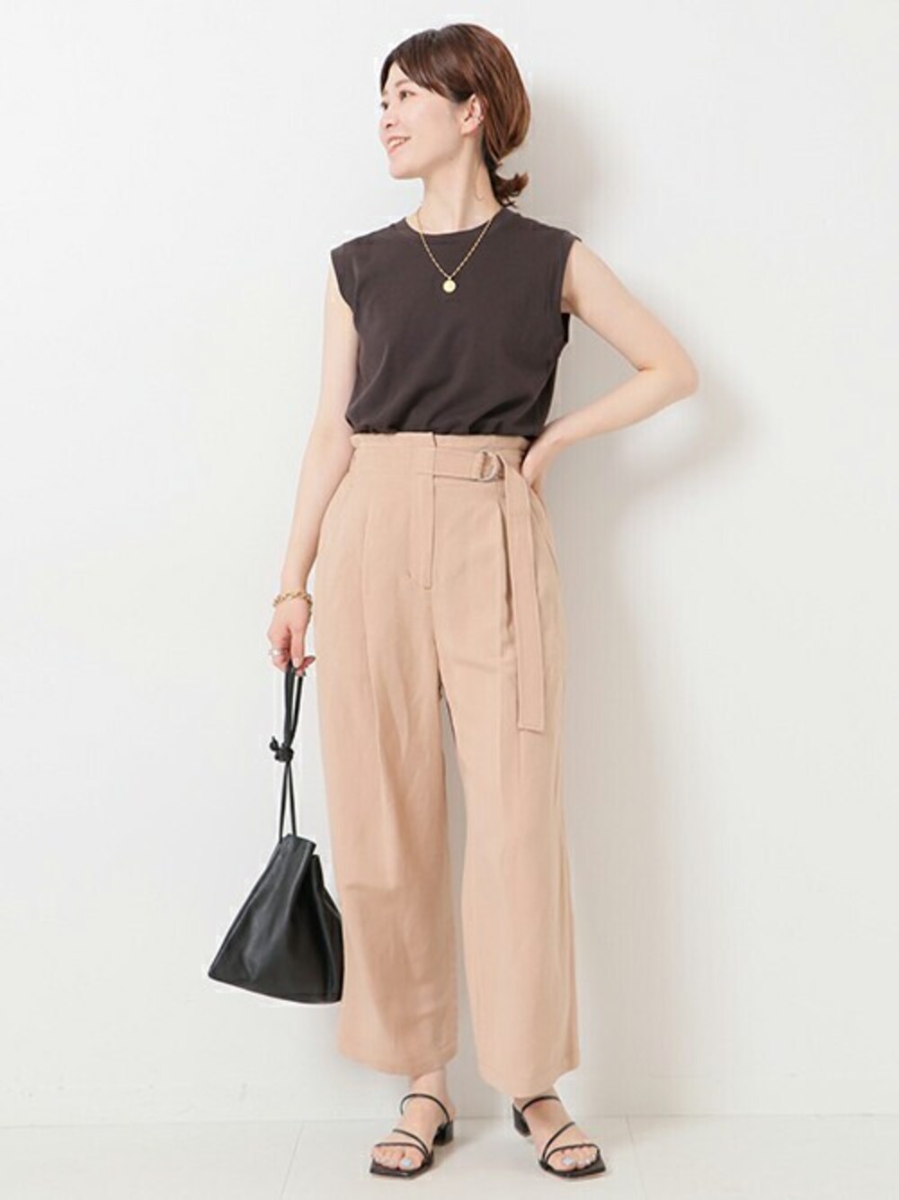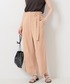 淡いベージュカラーのリネンパンツは、シンプルなノースリーブと合わせて。 インした時に見えるベルトデザインがウエスト位置を高く見せ、足長効果あり!