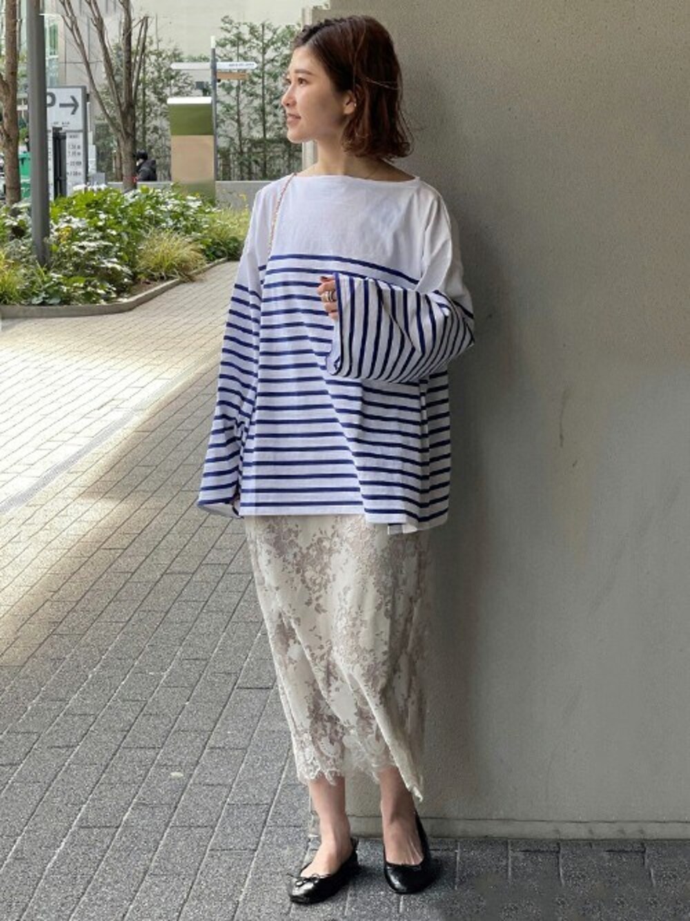 20代後半 / 身長:160cm / イエベ オータム / ストレート / 普段サイズ: 36~38 シルエットをフレア型にしたSpick & Span別注のLe minorボーダーカットソー。 オーバーでゆったりとしたシルエットながら、ボートネックが女性らしい印象。 カジュアルなボーダーにフェミニンなレーススカートを合わせた、spickらしいMIXスタイルにまとめました◎